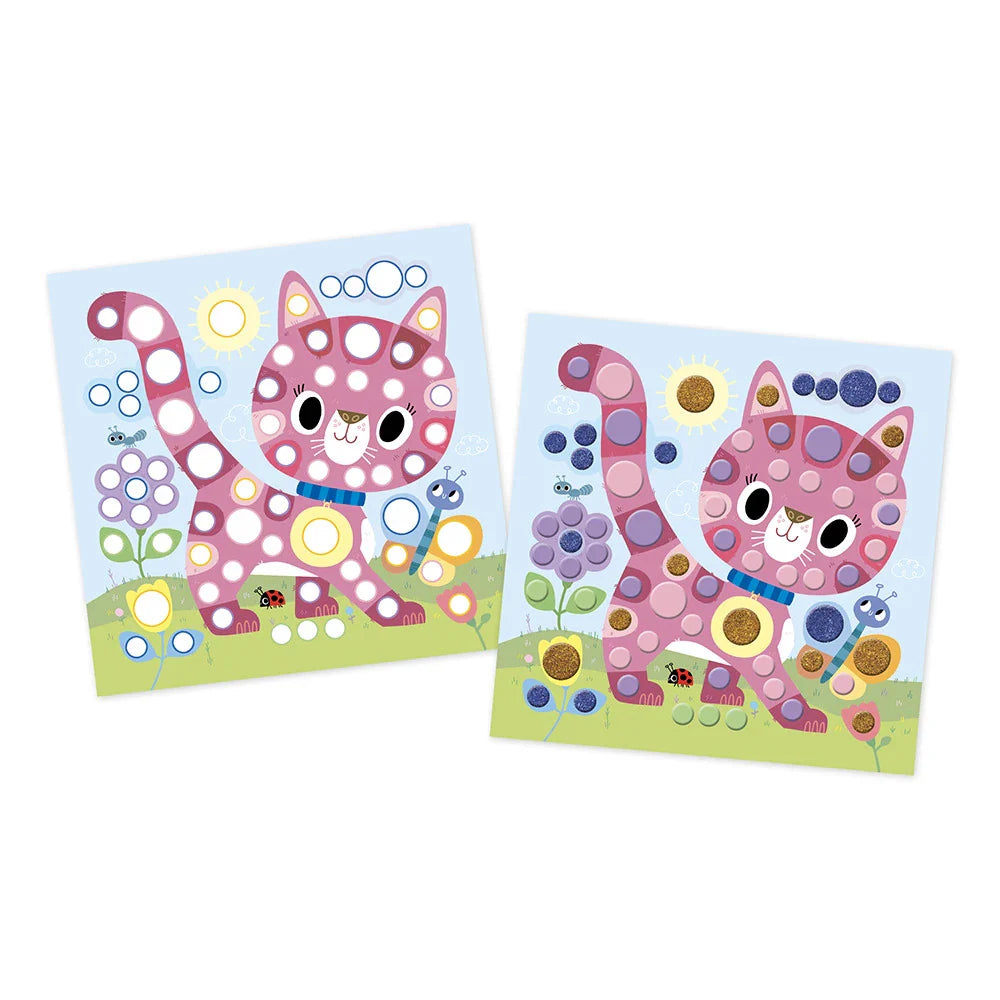 Med detta kreativa set från Janod kan små barn dekorera fyra bilder med hjälp av de runda skummosaikerna och skapa slående och färgglada illustrationer.