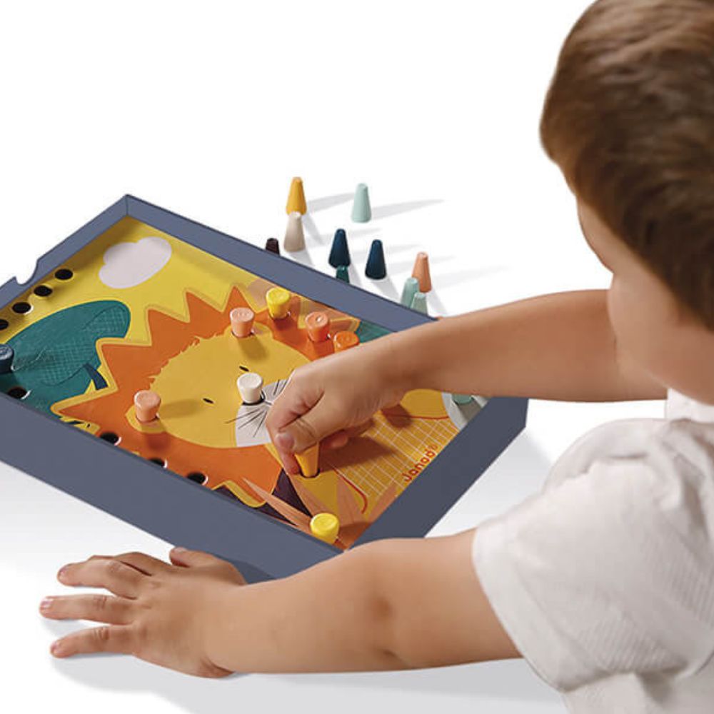 Janods träpussel består av barnmosaiker i tjock kartong med utskurna hål där du ska placera träpinnar i den färg som matchar bakgrunden på en viss plats i illustrationen.