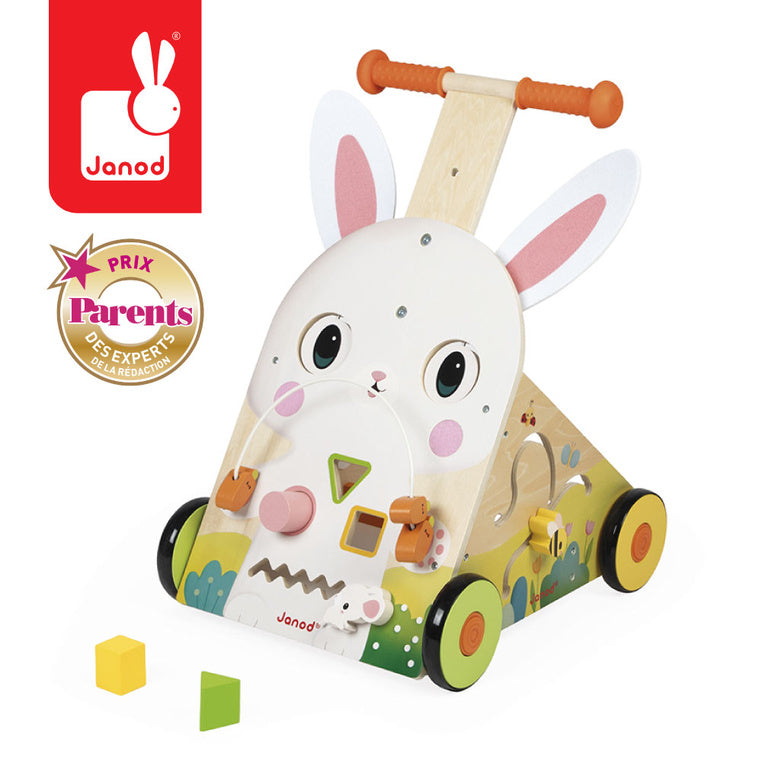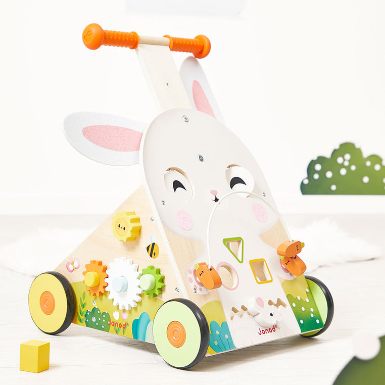Den träpusher i form av en bedårande kanin är en multifunktionell leksak som stöder barnets utveckling på många nivåer.