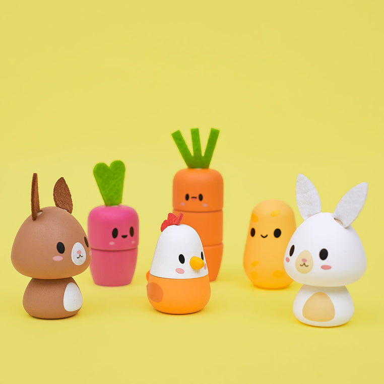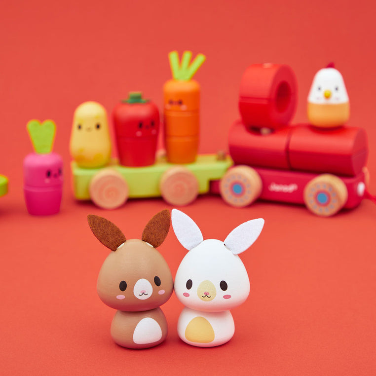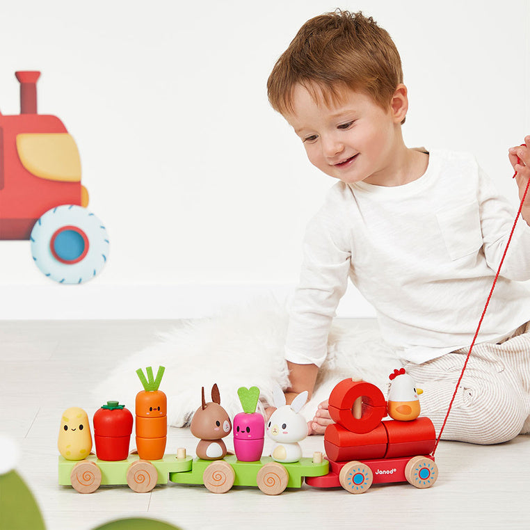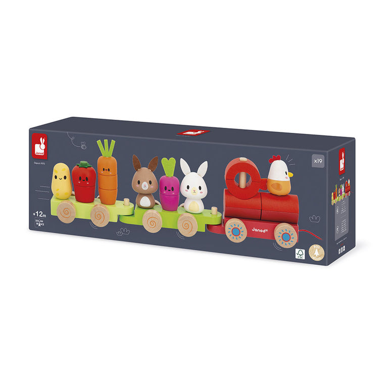 Satsen består av tre vagnar med stänger och upp till 19 färgglada delar att sätta ihop – inklusive delar av en lokomotiv, kycklingar, kaniner, grönsaker som potatis, tomat, rödbeta eller morot i flera delar.