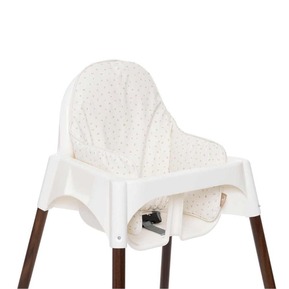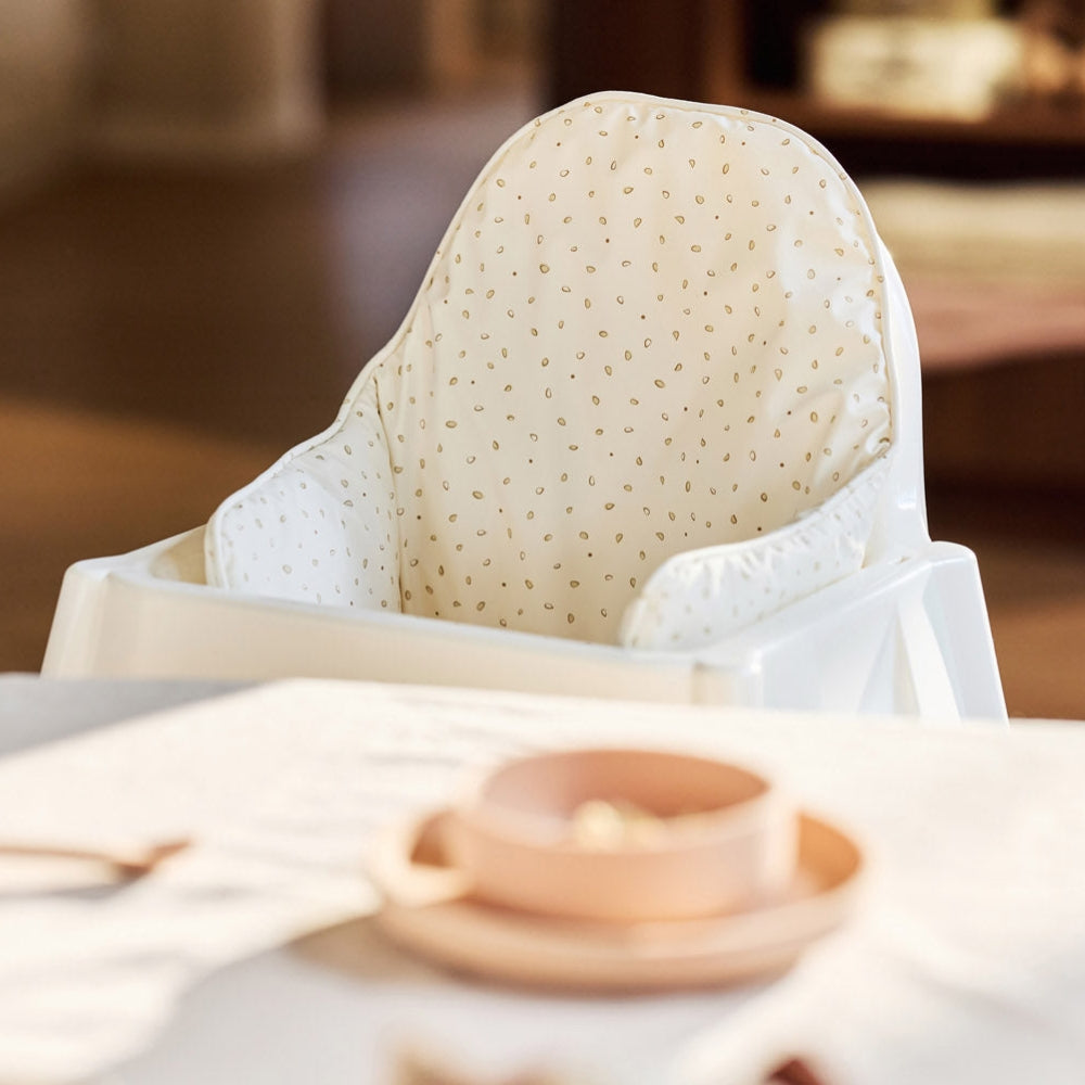 Matstolsdynan från Jollein med det söta Leafy Dreams-mönstret gör det mer bekvämt att sitta vid måltiderna.