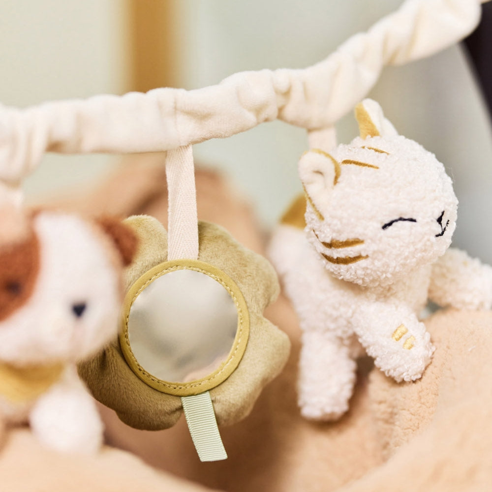 Setet består av en mjuk hund, en kattunge och en fyrklöver, som är utrustad med en liten spegel som uppmuntrar barnet att utforska sin egen spegelbild.