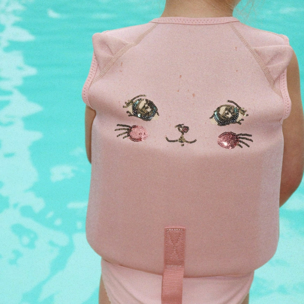 Simvästen med söta kattöron på axlarna är det perfekta stödet för ett litet barn som börjar vänja sig vid vatten.