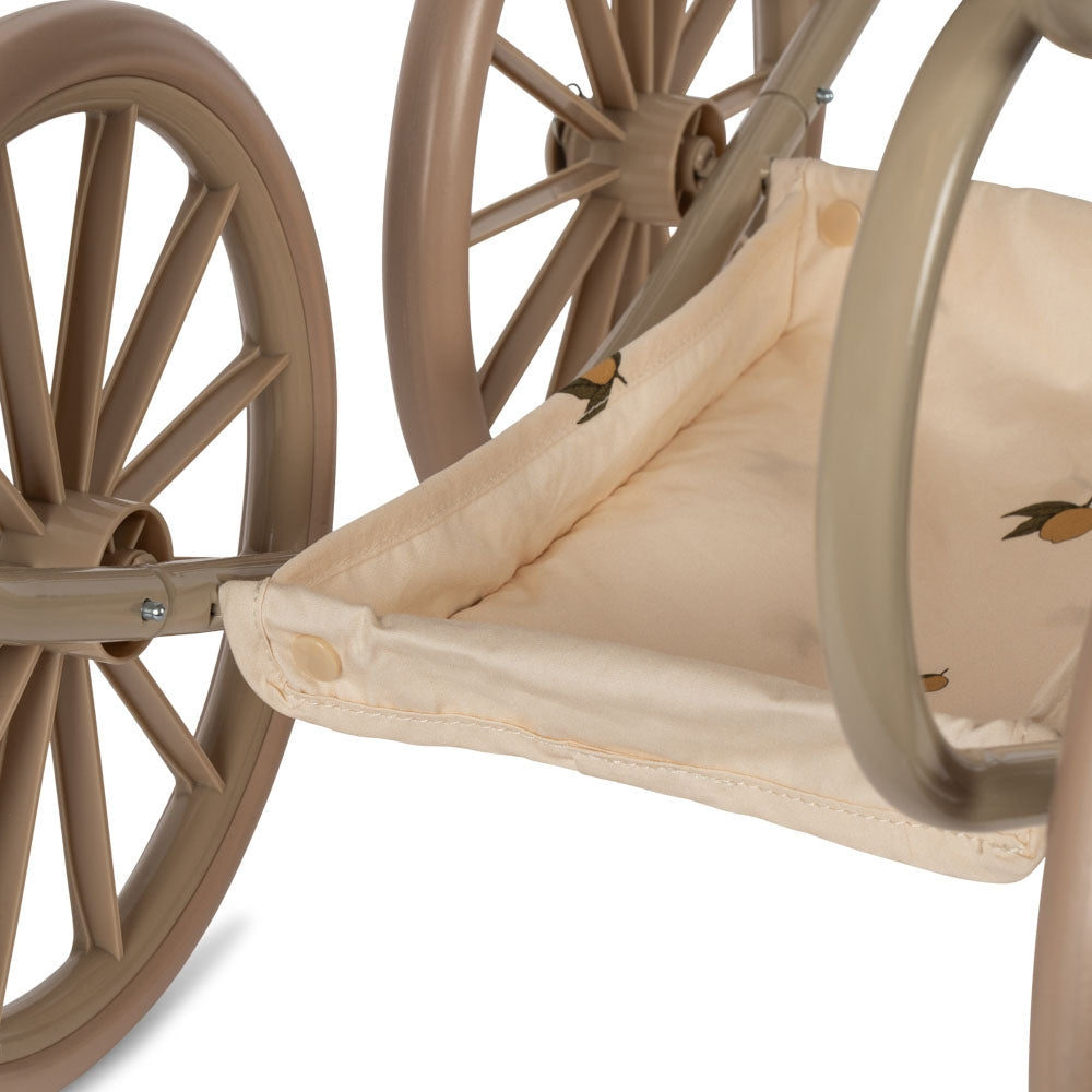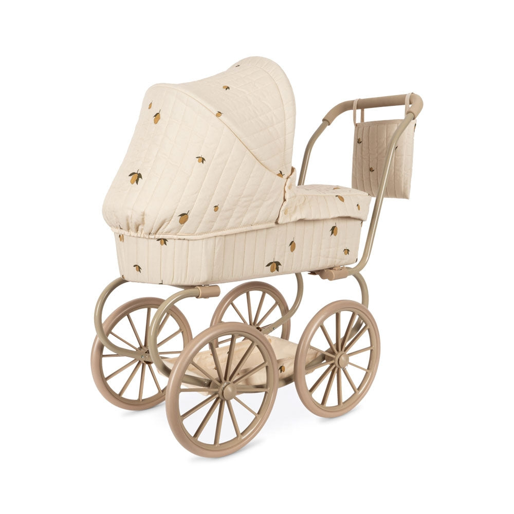 Minnie Lemon dockvagn från Konges Sløjd i vintagestil med fyra stora hjul och en liggdel.