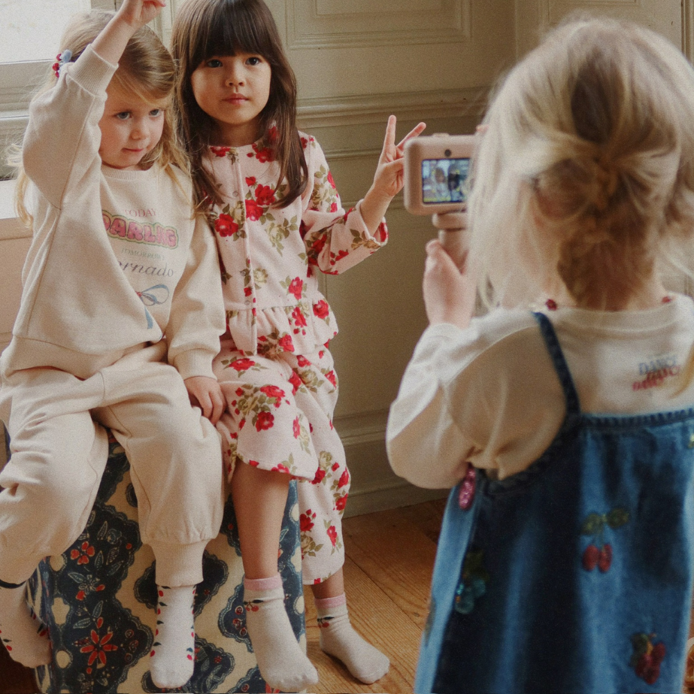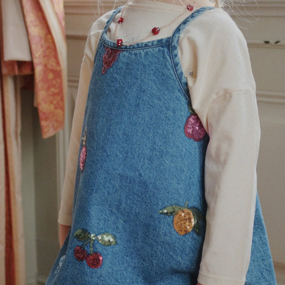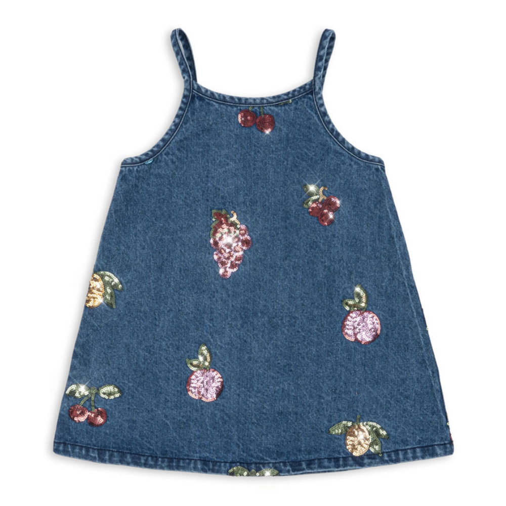 Denna denimklänning för barn från Konges Slojd imponerar med sin subtila glans – de broderade frukterna med paljetter bidrar till charmen och ger varje outfit en somrig, lekfull känsla.