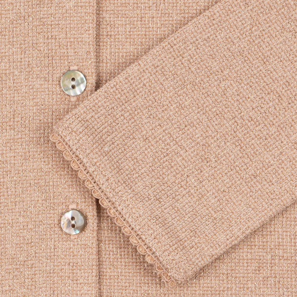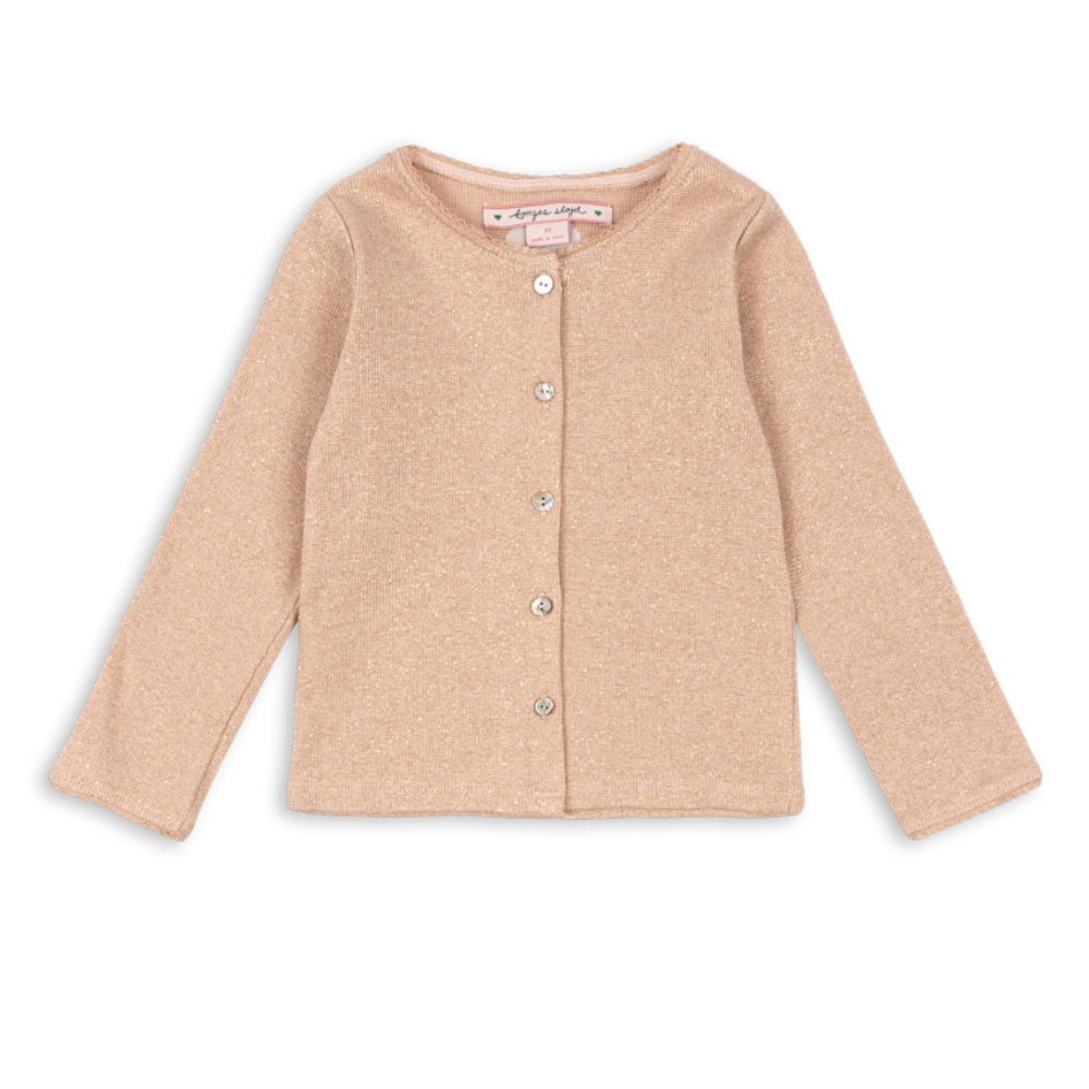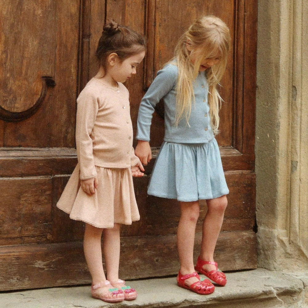 Det klassiska snittet med rund halsringning, fina ribbstickningar och eleganta pärlemorknappar gör att jumpern för flickor passar perfekt till både vardagliga och mer eleganta outfits.