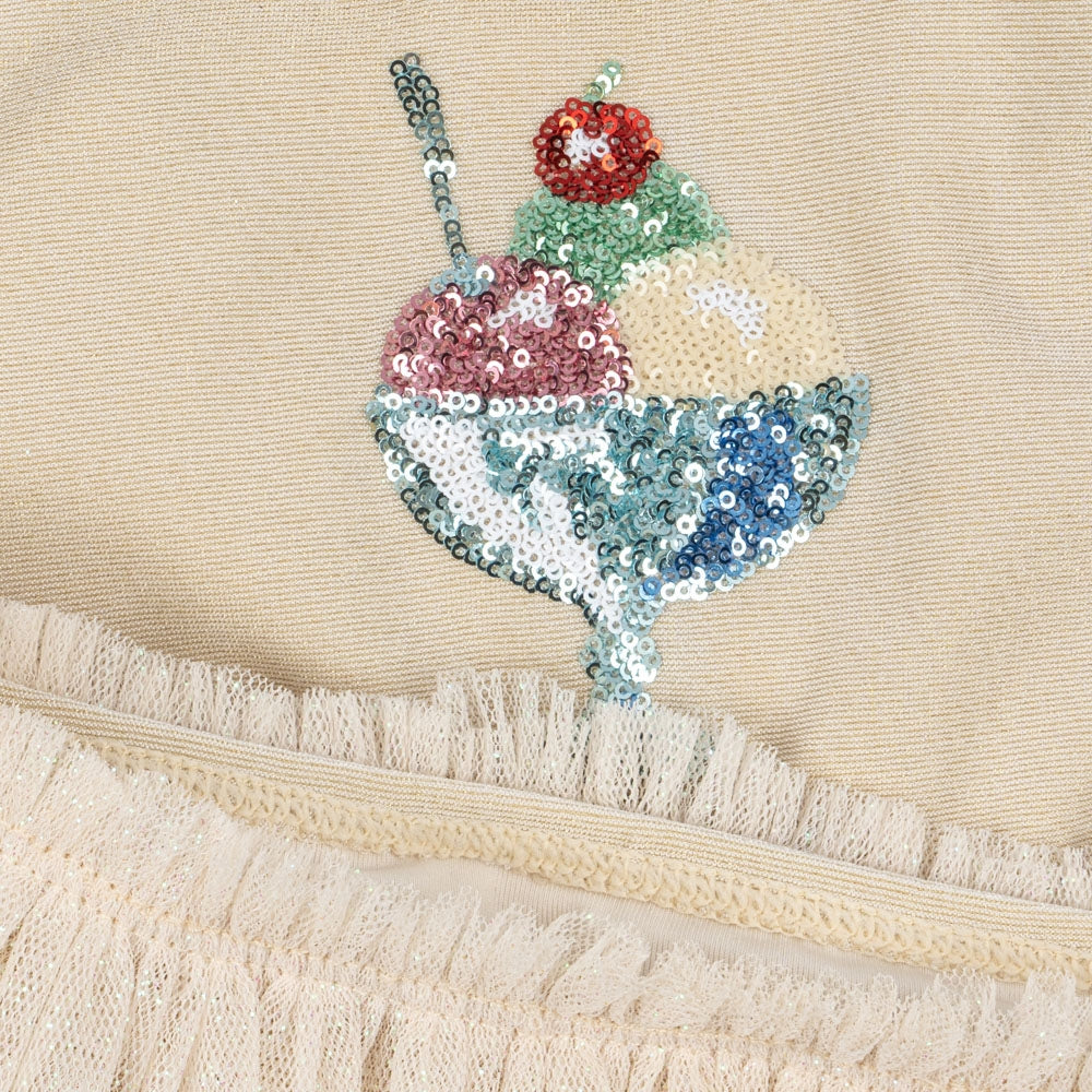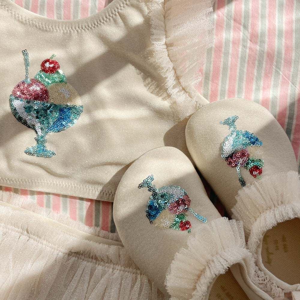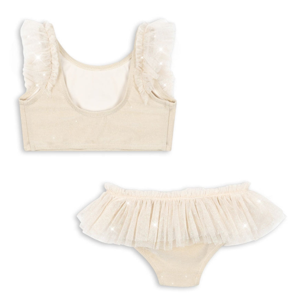 Das Modell Amandine von Konges Slojd besticht durch eine schimmernde Oberfläche und Tüllakzente, die ihm Leichtigkeit und mädchenhaften Charme verleihen.