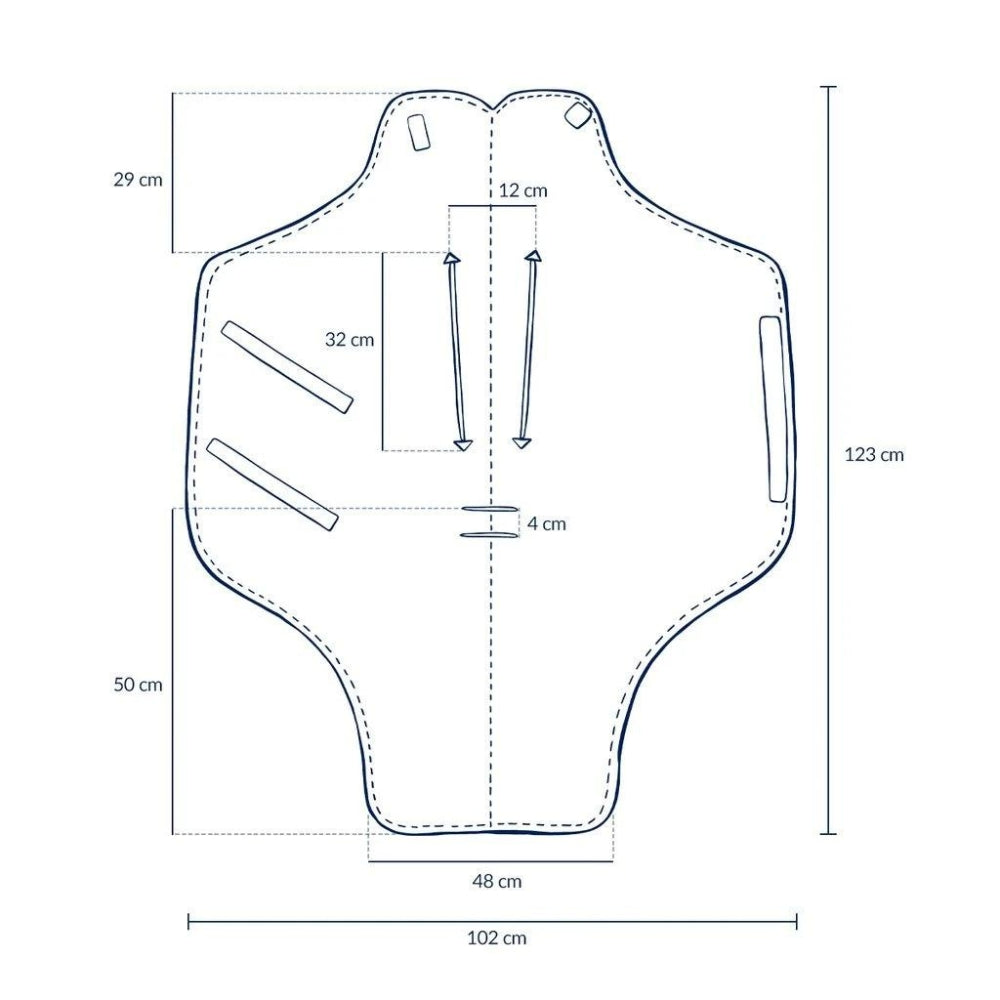 Filten har 4 hål för säkerhetsbältena, ett kardborreband utan tryck för att förhindra att filten rör sig och två kardborreband.