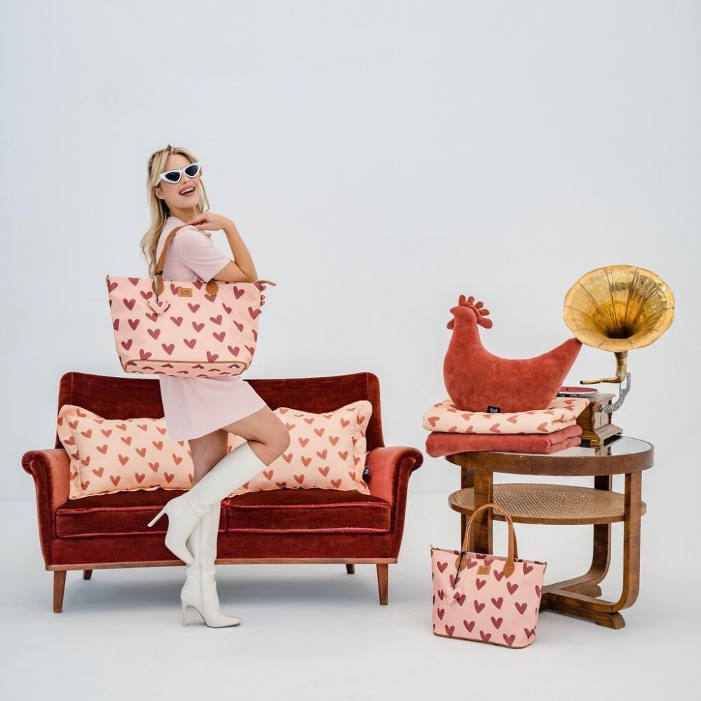 En vacker väska med ett rött hjärtmotiv på en rosa bakgrund.