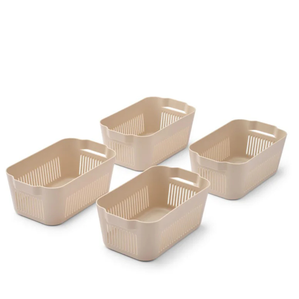 De fyra minikorgarna har praktiska handtag, är lätta och stapelbara när de är tomma.