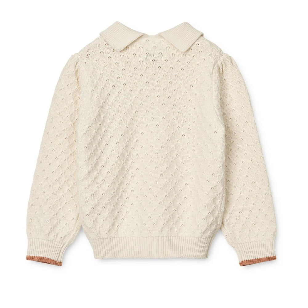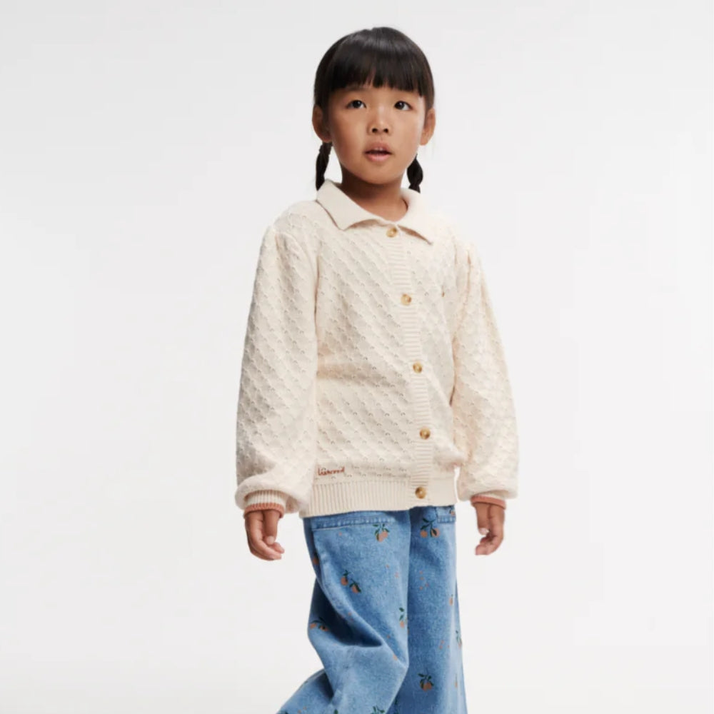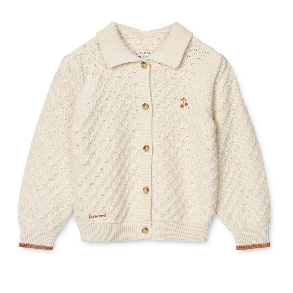 Liewoods kofta har en klassisk design med polokrage och kontrasterande muddar och passar perfekt till alla barns kläder och ger dem charm och elegans.