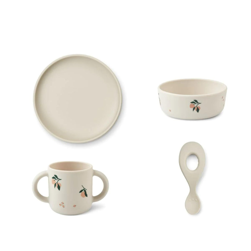 Alla delar kommer i mjuka beige färger och tallrikarna har ett sött persiko-motiv som garanterat kommer att tilltala alla småttingar.