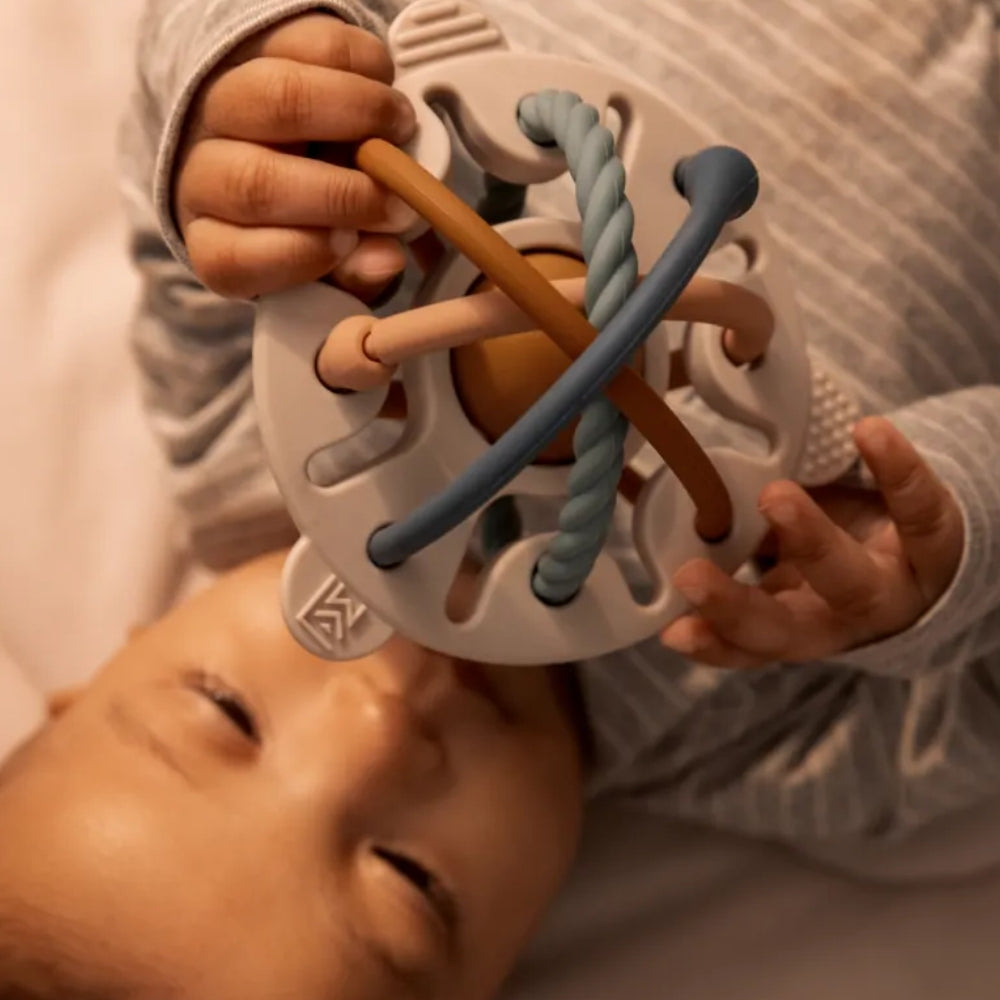 Tack vare sin smarta design och mjuka silikonyta lindrar leksaken inte bara ömma tandkött, utan stimulerar också sinnena och utvecklar handens fingerfärdighet från de första dagarna i livet.