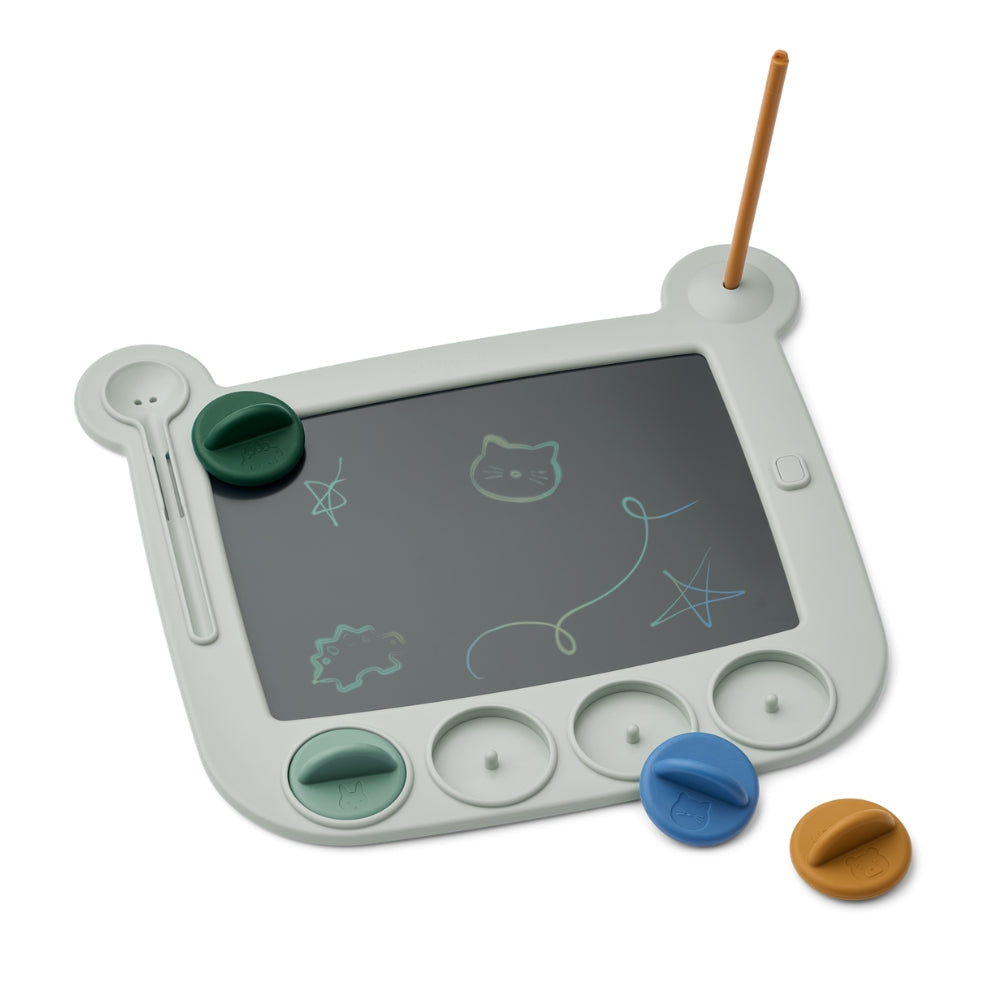Liewood-produkten är utrustad med en LCD-skärm, en speciell penna och fyra silikonstämplar för att skapa omedelbara former.