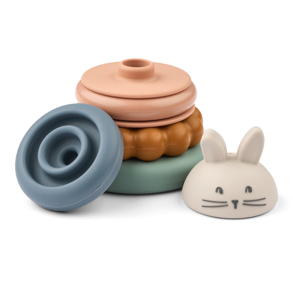 Varje del av Liewoods torn har sin egen unika funktion – den kaninformade toppen kan användas som badleksak, den rosa kanten är en skallra och den bubbliga strukturen på en av ringarna fungerar som en minisil.