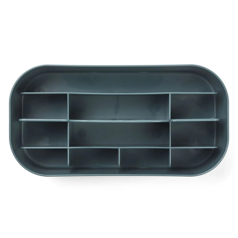 Den har många fack och kan användas för att sortera kritor, linjaler, pennor eller andra småsaker som behövs för lek och lärande.