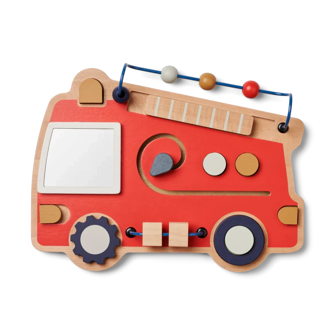Ett manipulerbart träbräde för barn i form av en brandbil från Liewood.