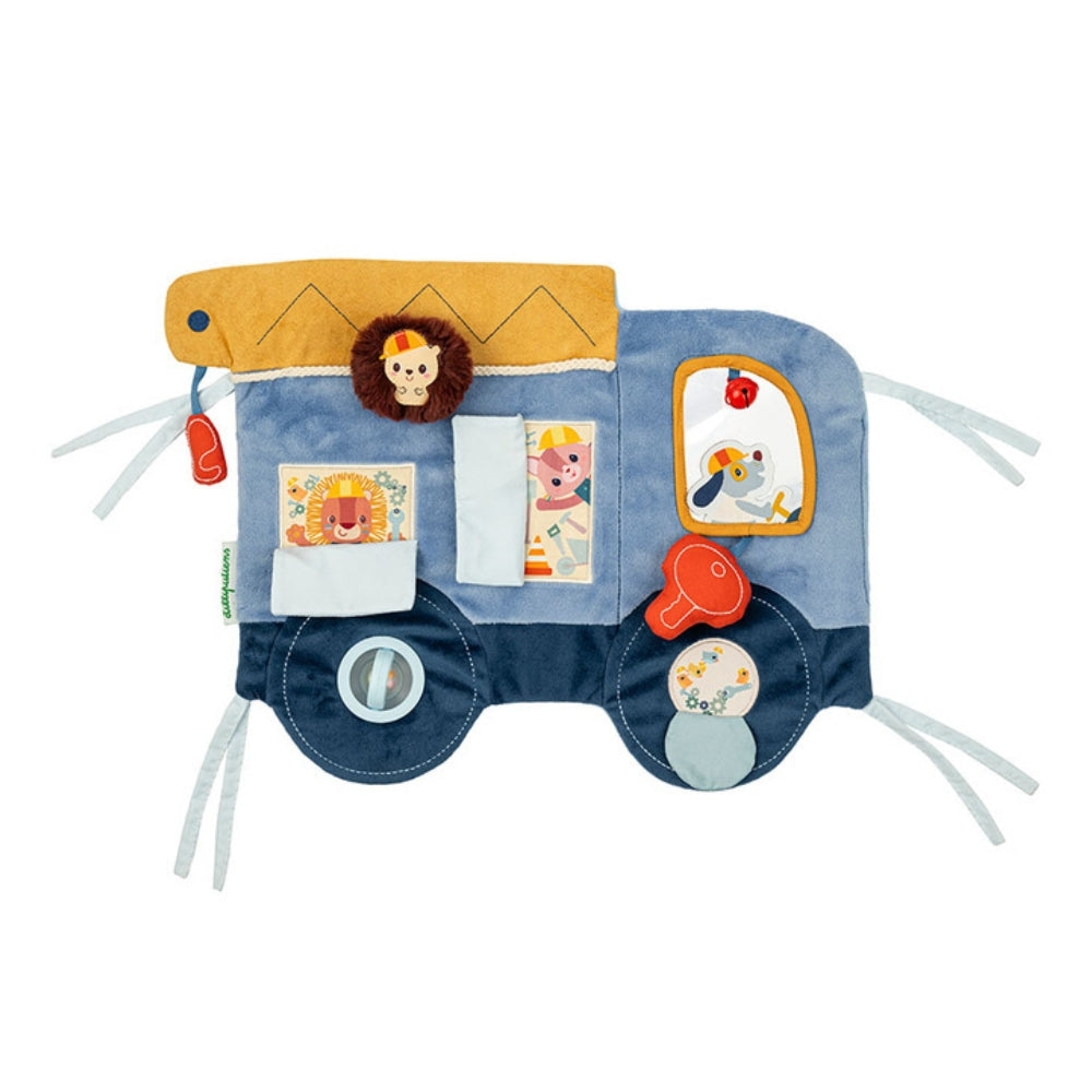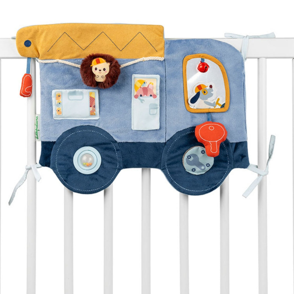 Den stora lastbilsformade panelen kan enkelt fästas på en spjälsäng eller annan yta tack vare praktiska band.