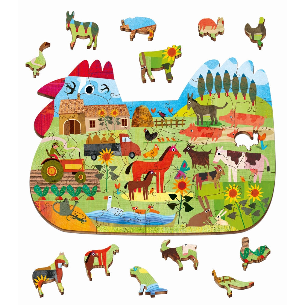 Ett vackert illustrerat träpussel med en ovanlig form.