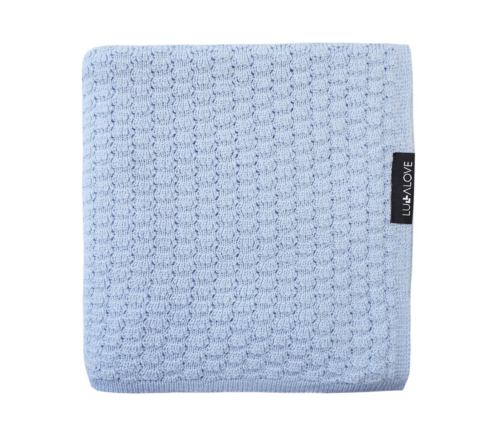 Den mjuka merinoullsfilt med fjärilsmönster i blått kan också användas som babysjal från LullaLove.