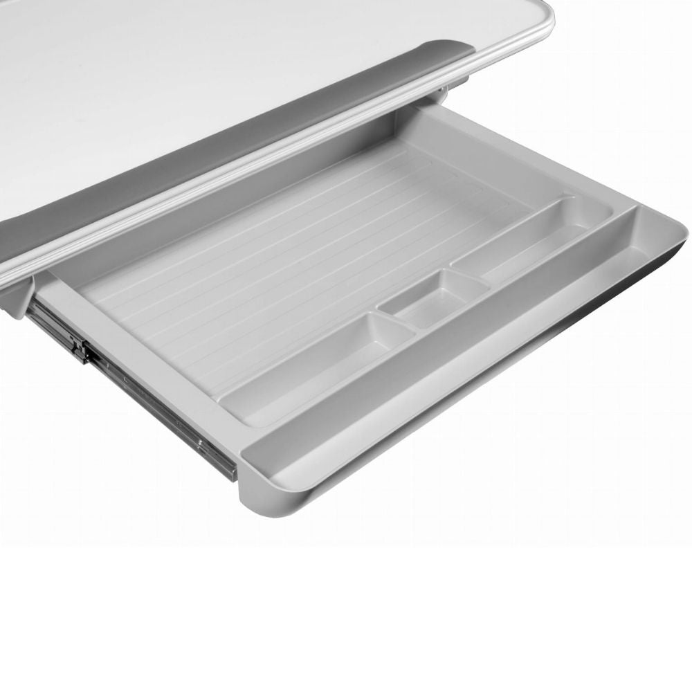 Skrivbordet är utrustat med: 1. en stor låda med måtten 57x35x5, som har utformats som en organisatör. 2. På bordsskivan finns ett speciellt ergonomiskt handledsstöd. Det fyller också funktionen att stoppa t.ex. en anteckningsbok när bordsskivan lutas. |
