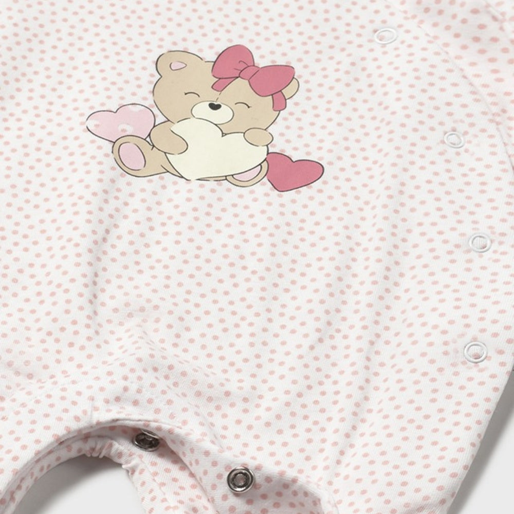Babyoverallen från Mayoral har ett tygfäst spänne som löper längs hela plaggets längd, vilket gör det enkelt att byta blöja.