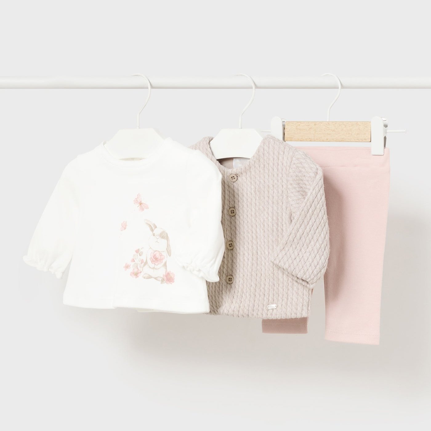 Babykläder från Mayoral är ett fantastiskt 3-delat set med kaninmotiv.
