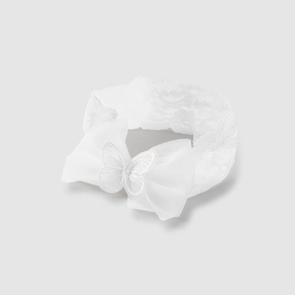 Babyhårbandet imponerar med ett delikat fjärilsmönster som perfekt kompletterar barnets look.