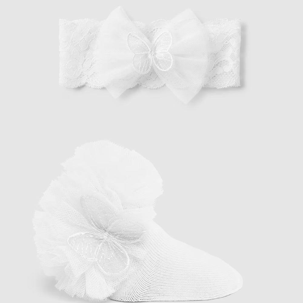 Babystrumpor och pannband med rosett i färgen Cream från Mayoral.