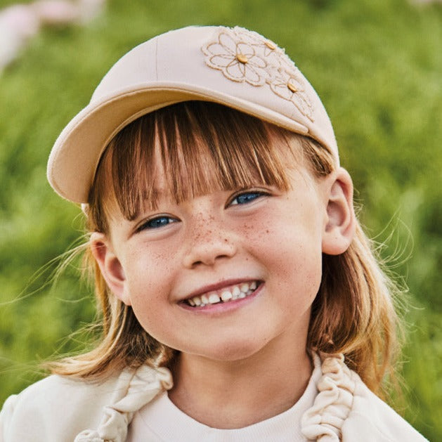 Denna baseballkeps för flickor är tillverkad i en delikat mandelblommig färg – den passar perfekt till en mängd olika stilar.