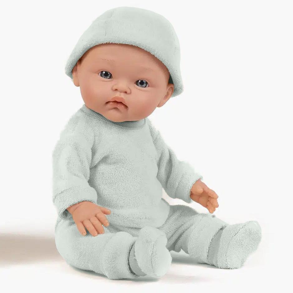 Dockan är 36 cm lång och levereras med fleecepyjamas och en turkosfärgad mössa.
