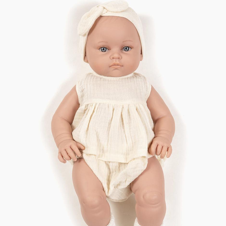 Dockan är 47 cm lång och levereras med en vacker vit jumpsuit, hårband och vita strumpor.