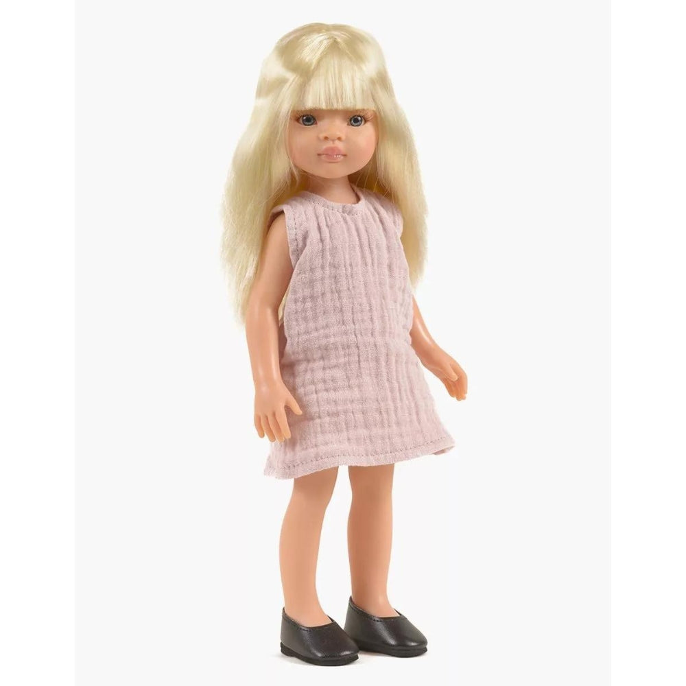 Dockan är 32 cm lång och kommer med en vacker rosa klänning, underkläder och svarta skor.