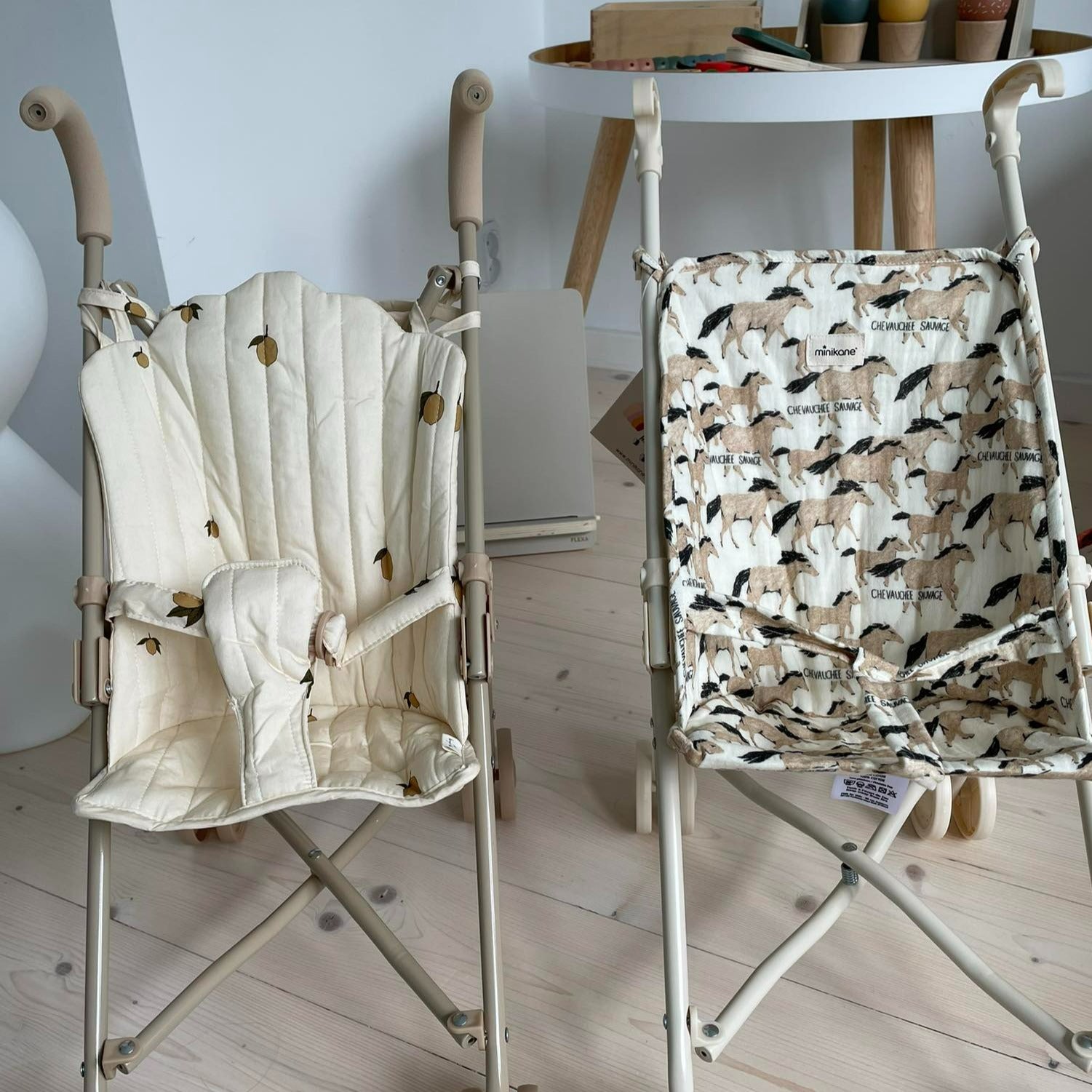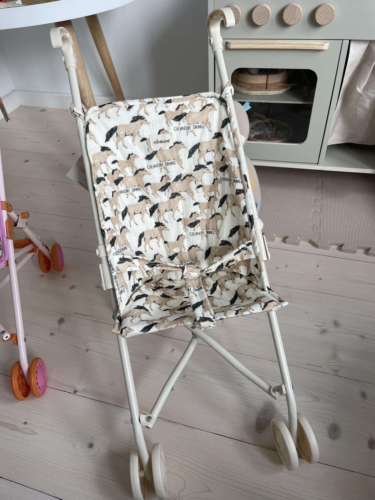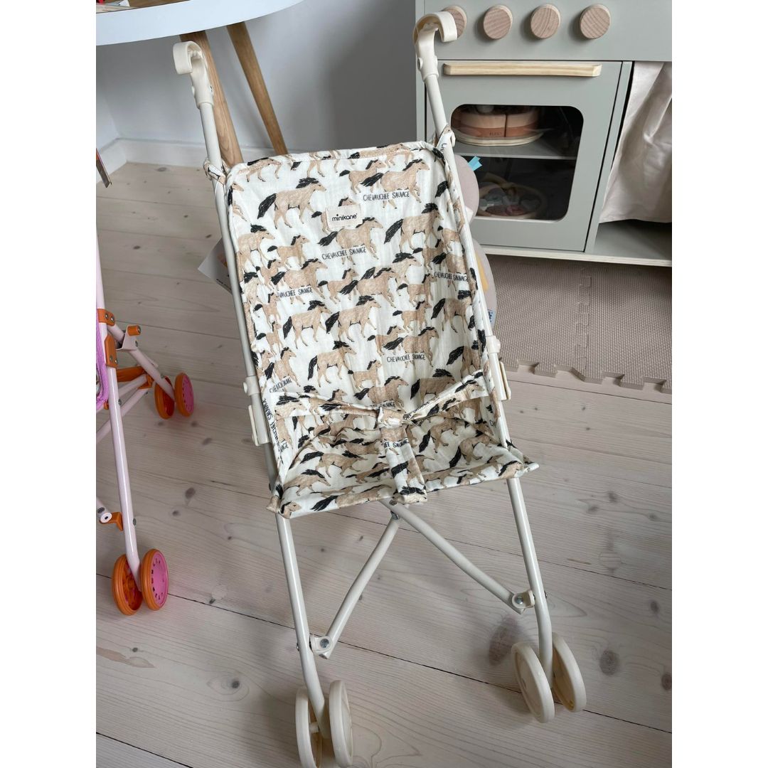 Den hopfällbara dockvagnen har ett vackert hästmotiv.