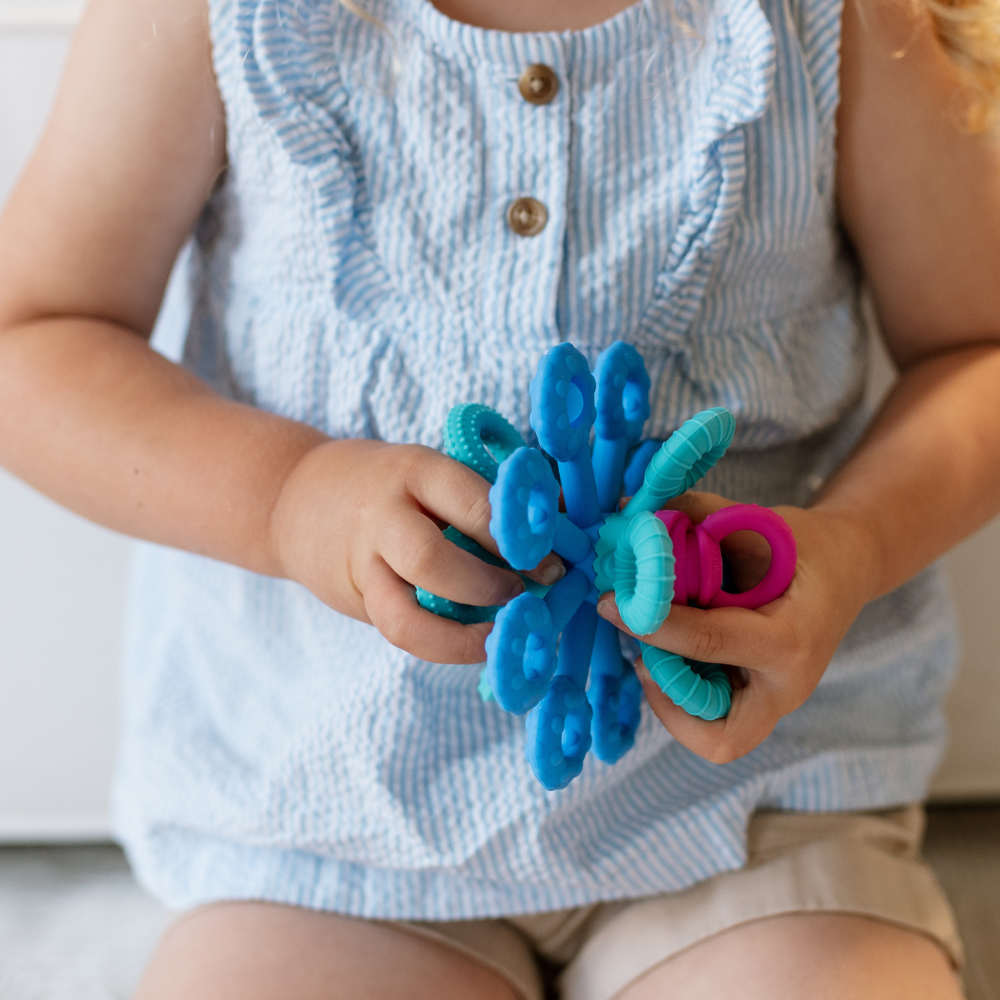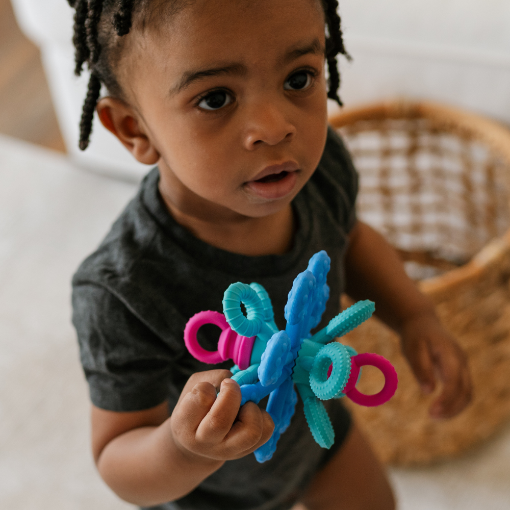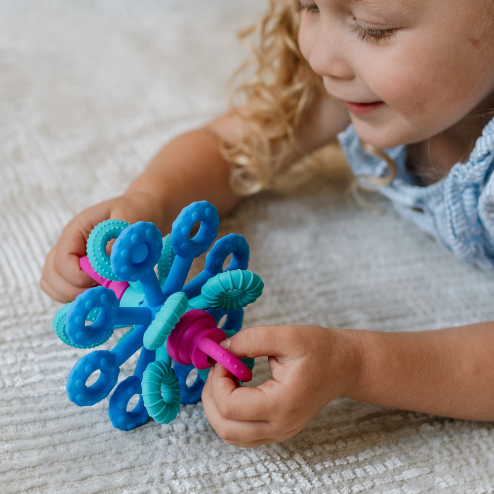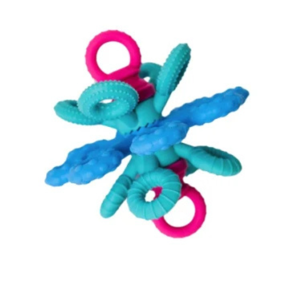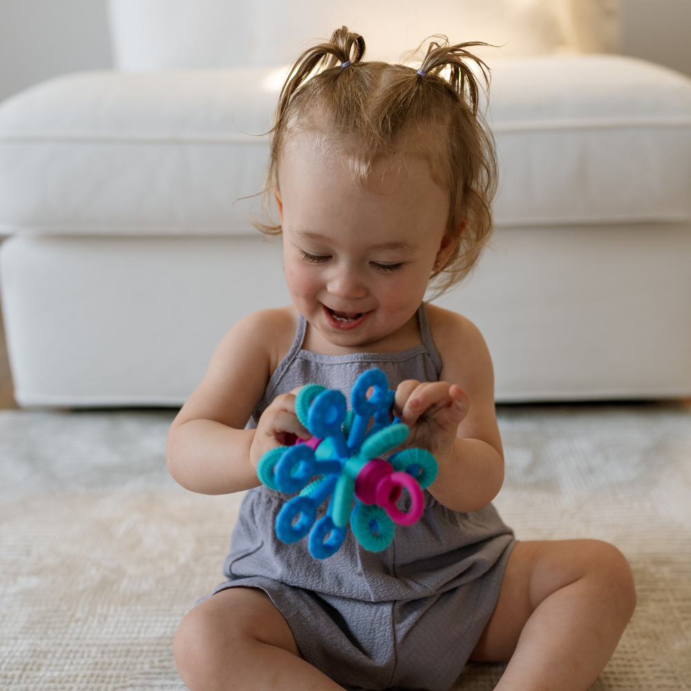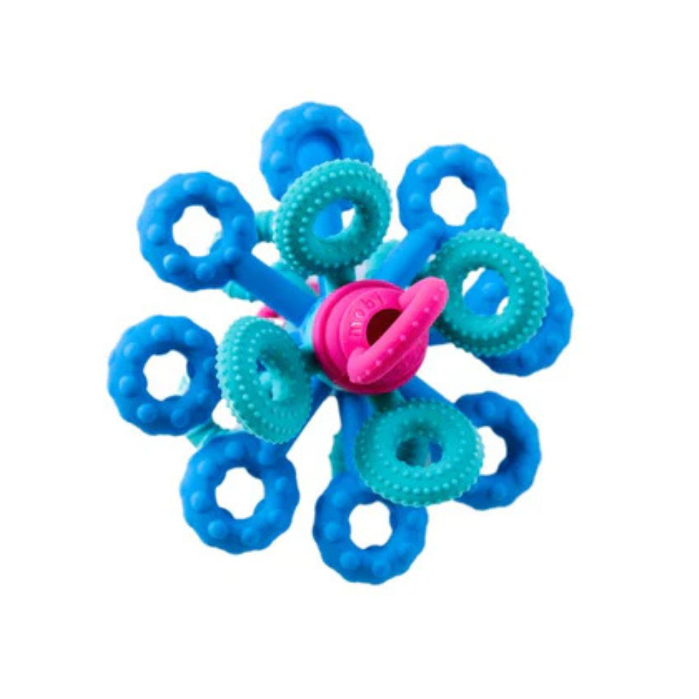 Dess 18 flexibla silikonarmar uppmuntrar till att sträcka, klämma, vrida och bita, medan de tre ringarnas tandade kanter ger behagliga, mjuka vibrationer när de roteras.