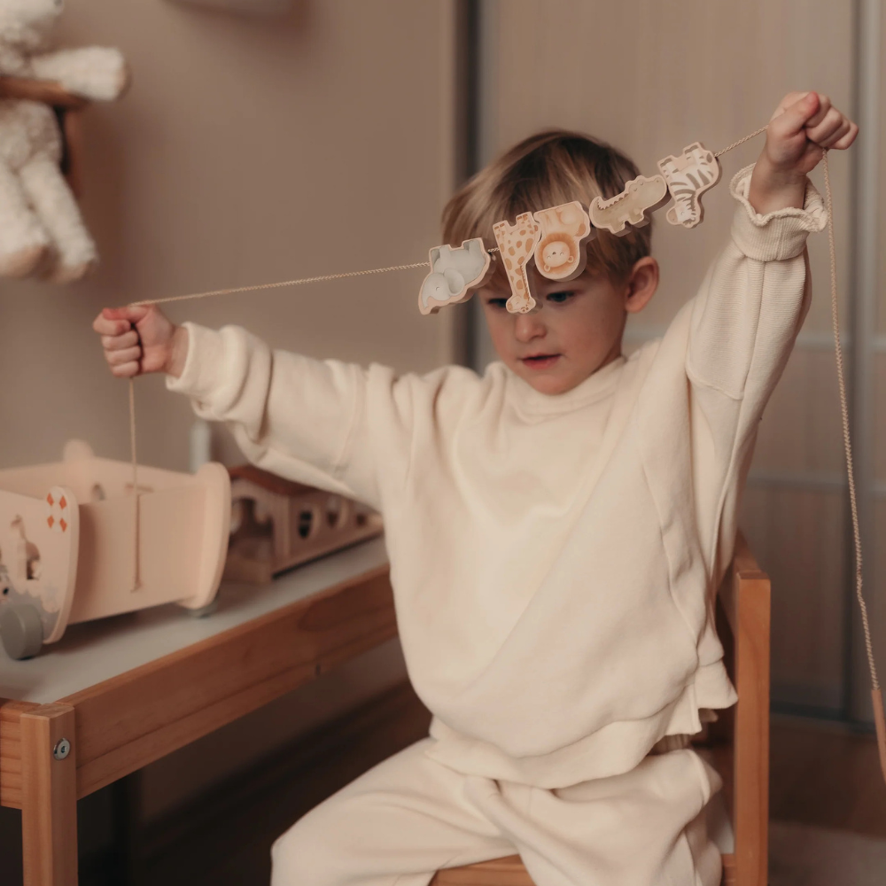 Setet innehåller upp till 22 delar: 14 djur, en regnbåge, en trappstege, en båt med hjul och ett snöre med träspets för att trä figurerna genom.