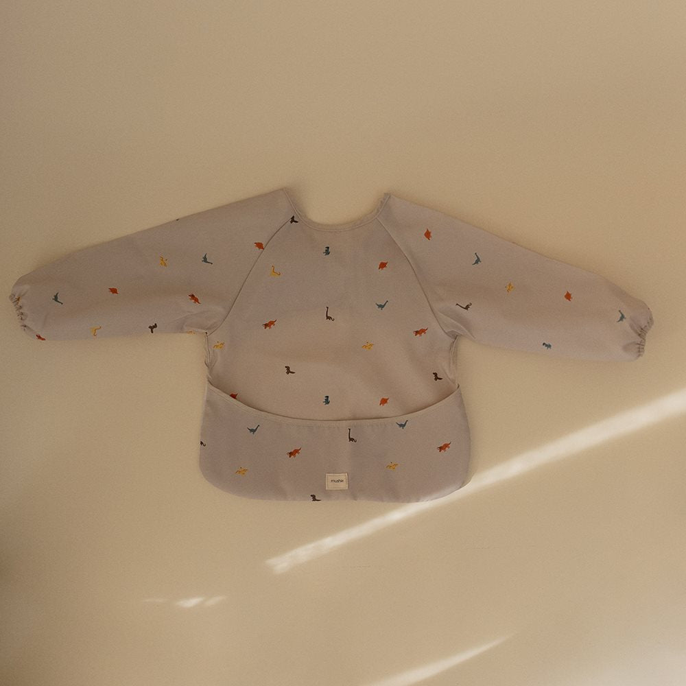 Mushies ärmförsedda haklapp har ett vackert dinosauriemotiv.