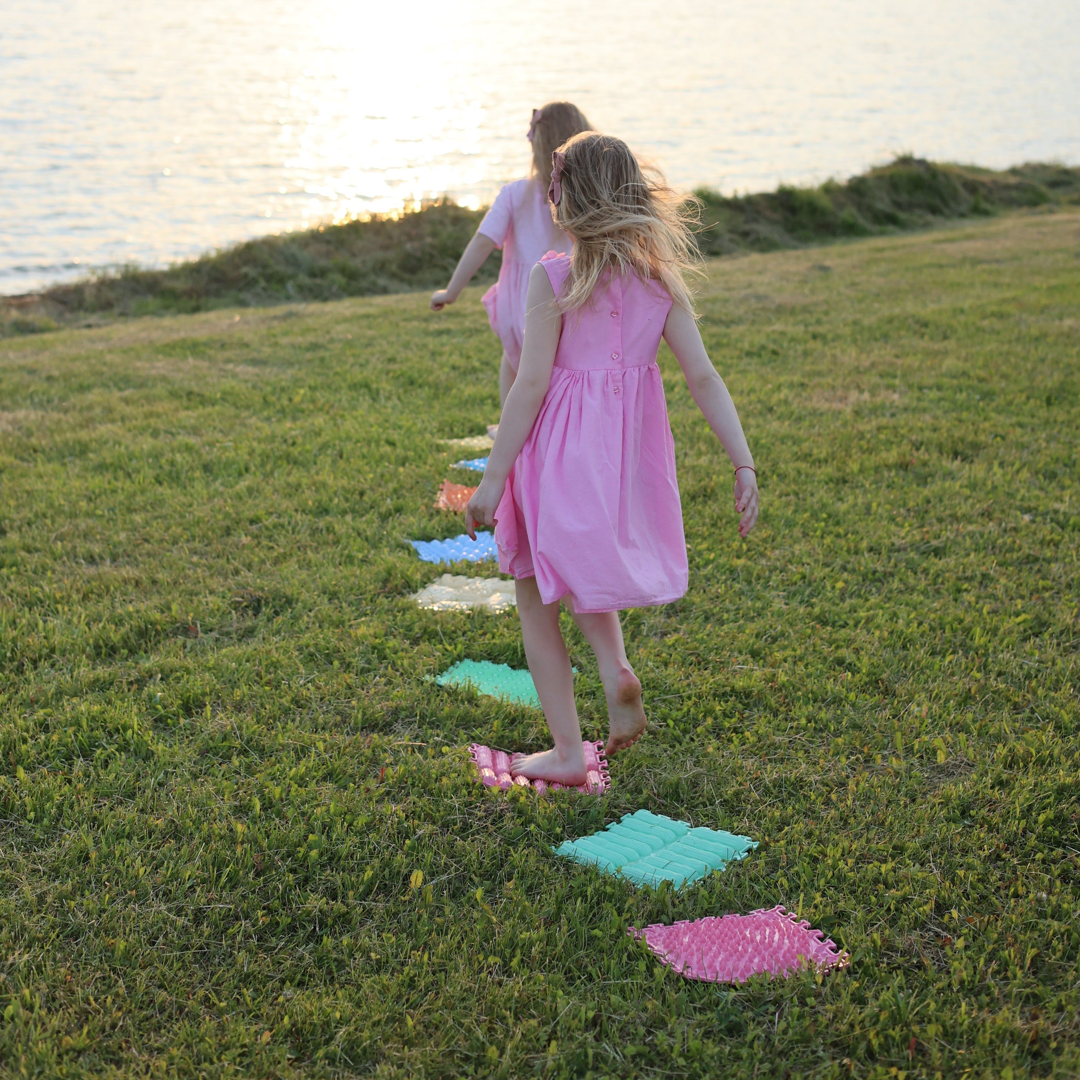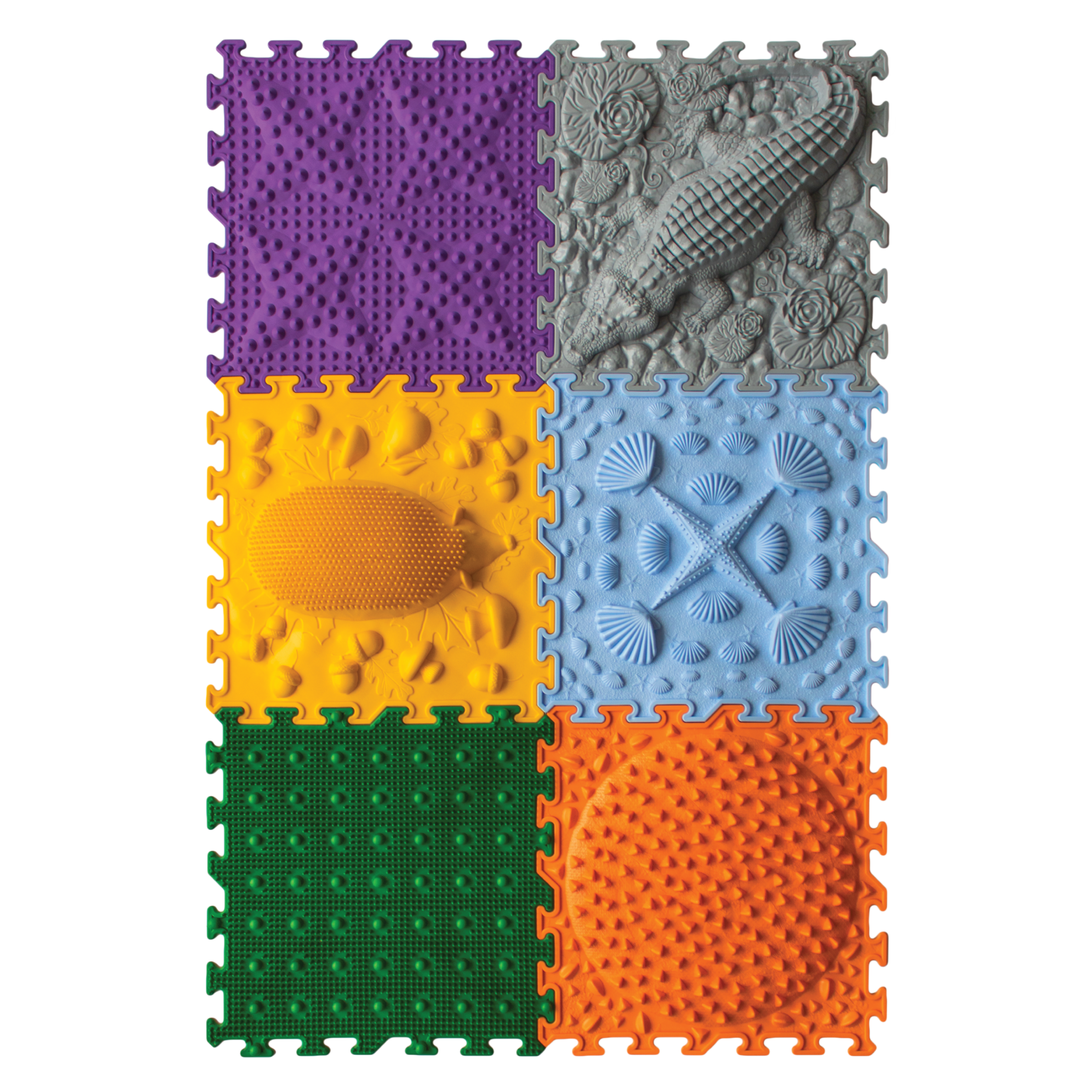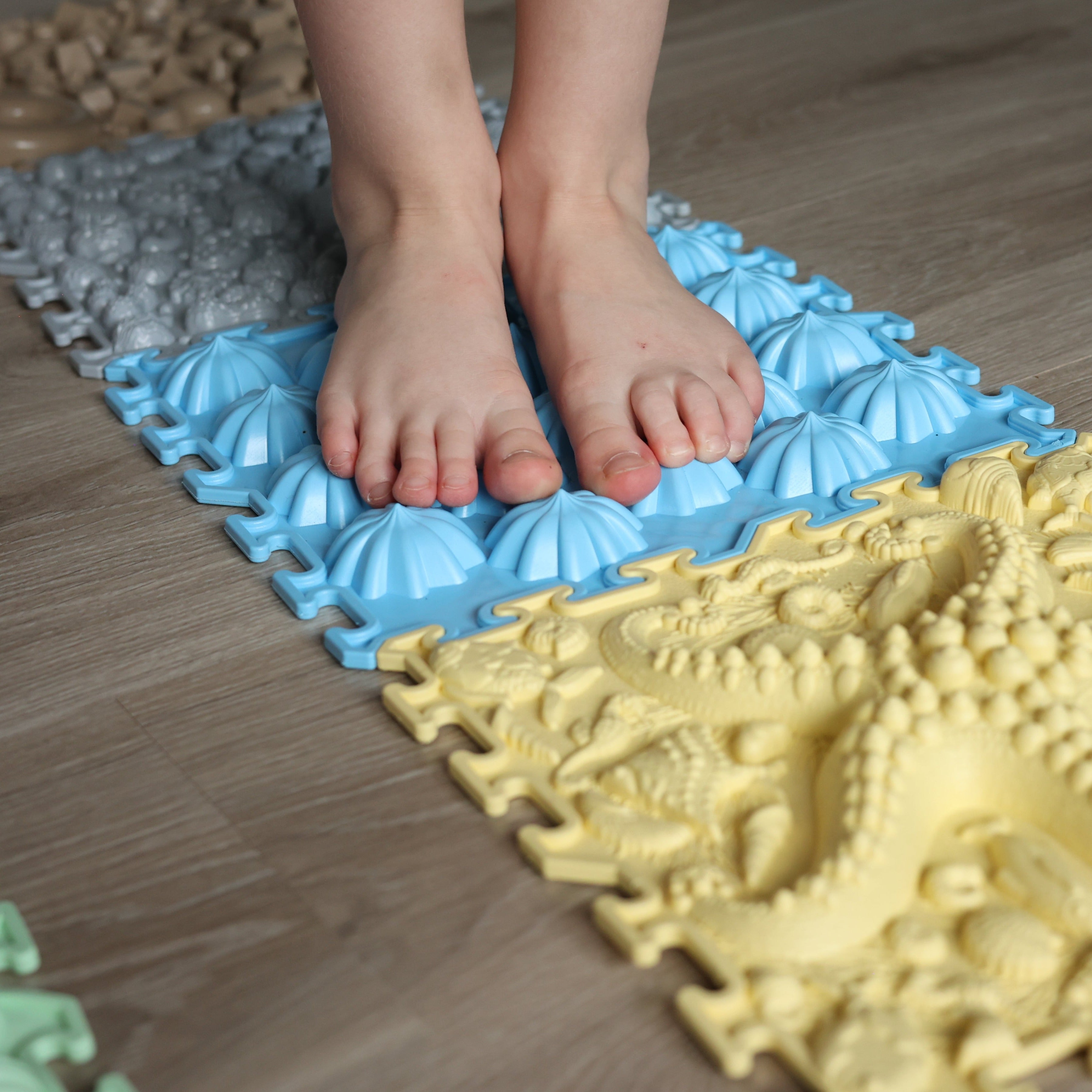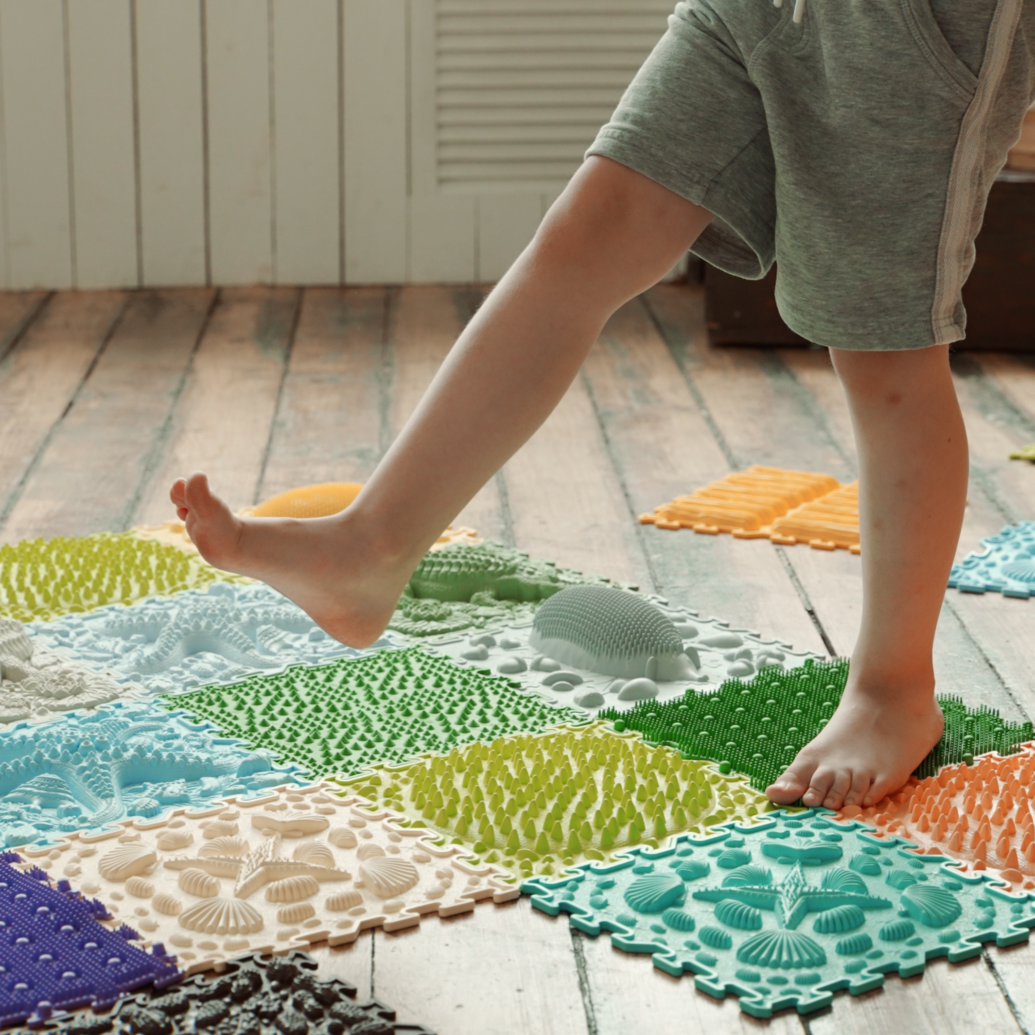 Den sensoriska mattan från Ortonature erbjuder ett brett utbud av texturer och färger som stimulerar fantasin, förbättrar blodcirkulationen, hjälper till att korrigera platta fötter, hjälper till att ta bort svullnad i benen och stöder vestibulära systemet.