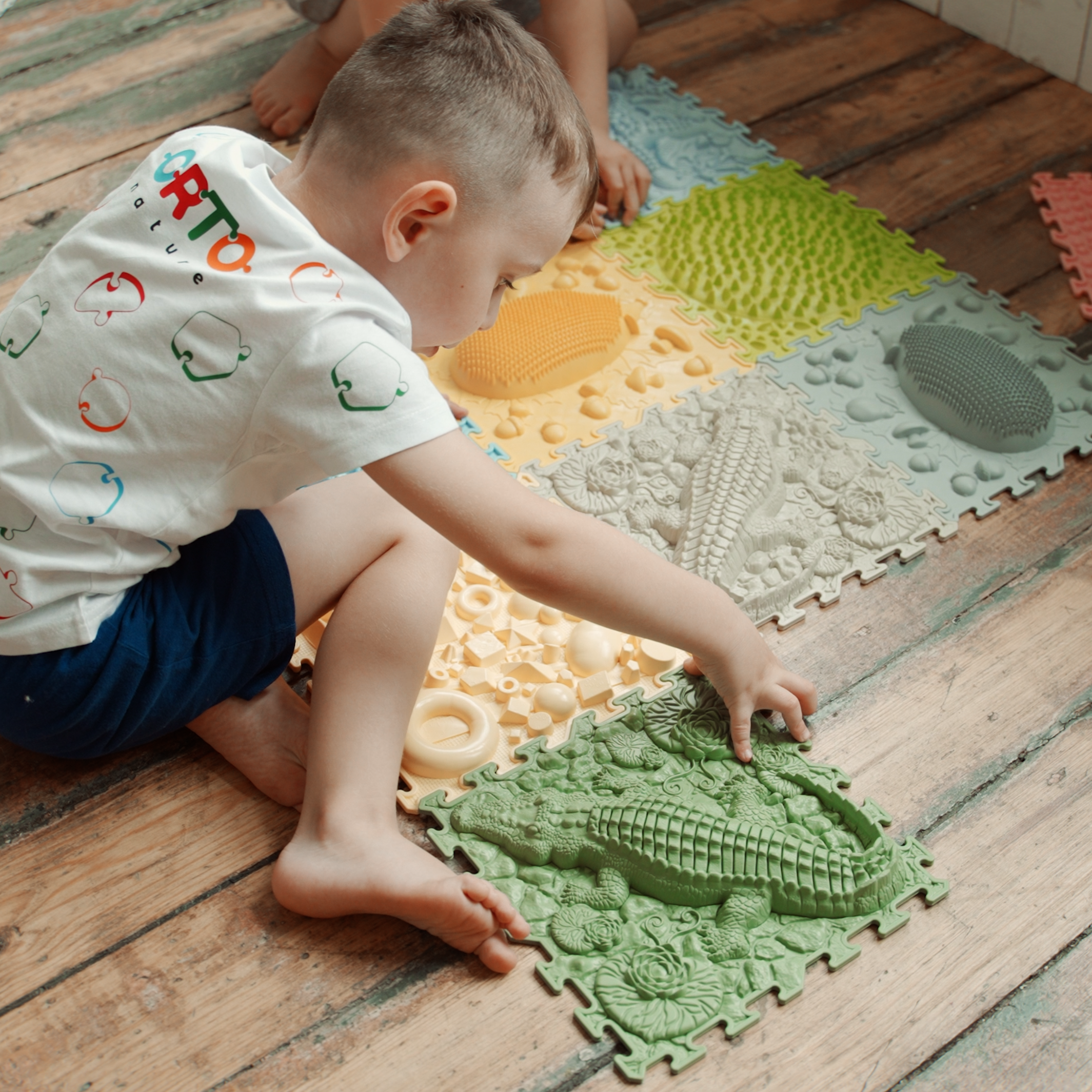 Till en början tittar barnet på formerna på mattan, och de olika texturerna och elementen gör leken mer och mer intressant.