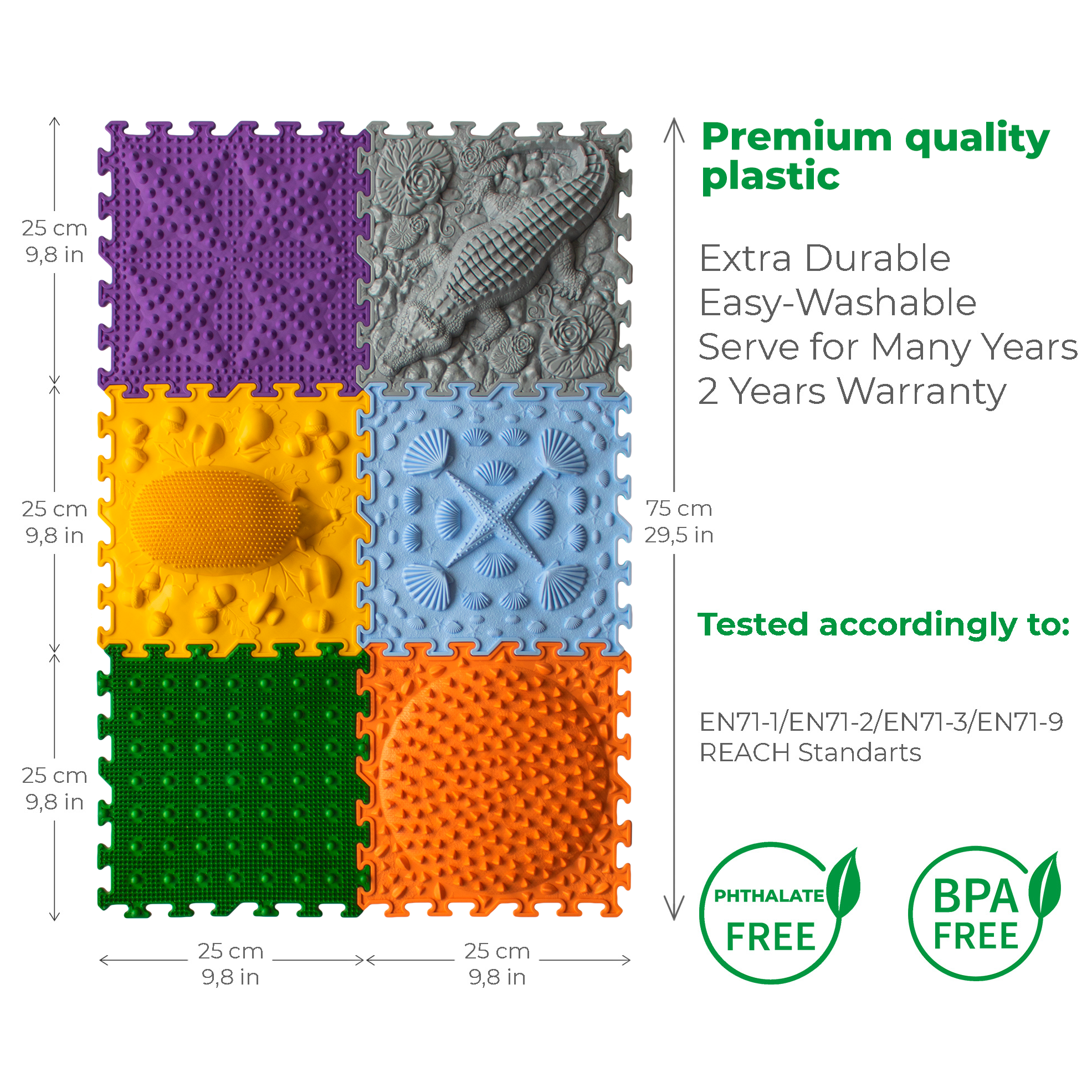 Ortonatures sensoriska matta är tillverkad av högkvalitativ PVC (polyvinylklorid) utan BPA och ftalater, vilket gör den hållbar, lätt att tvätta och med en lång livslängd.