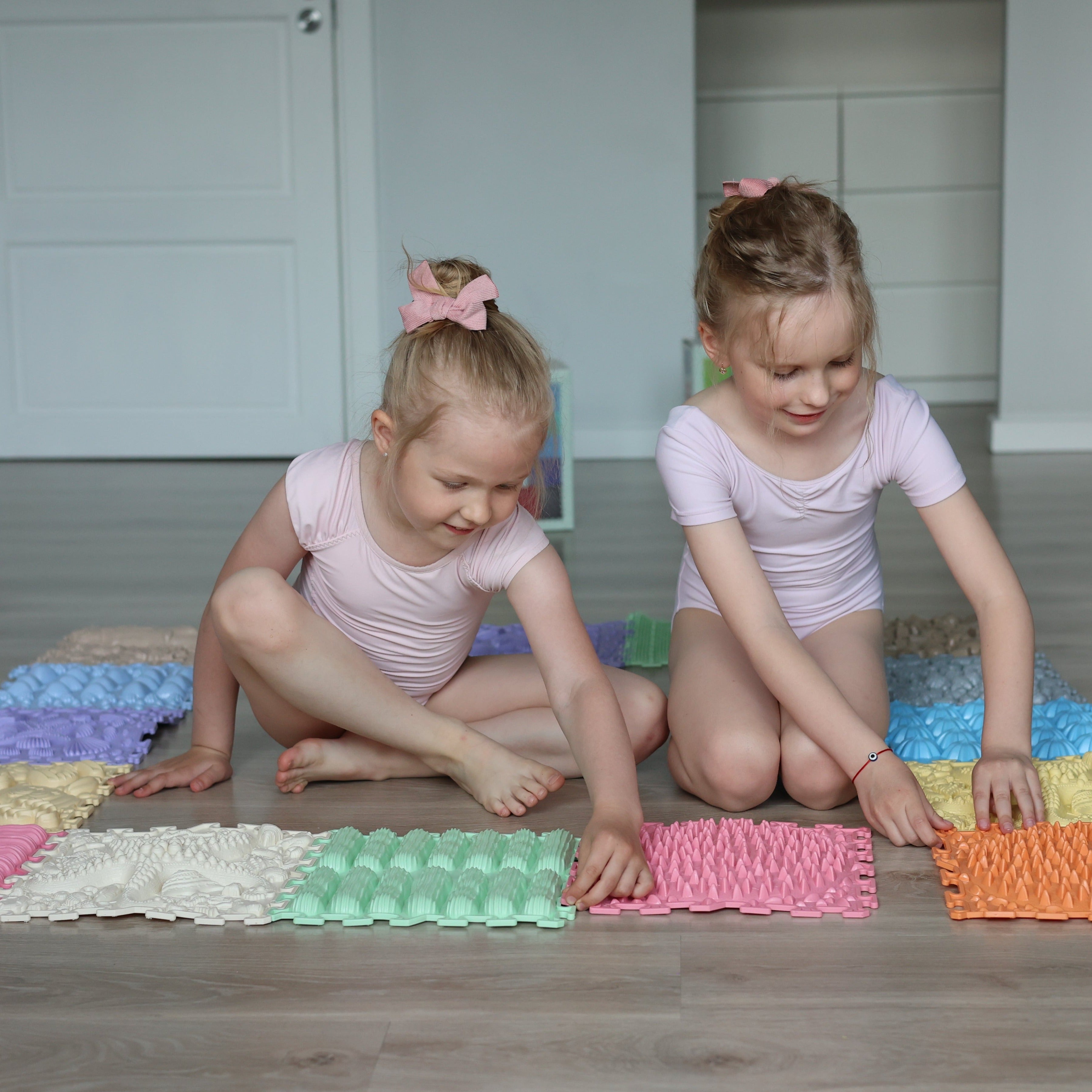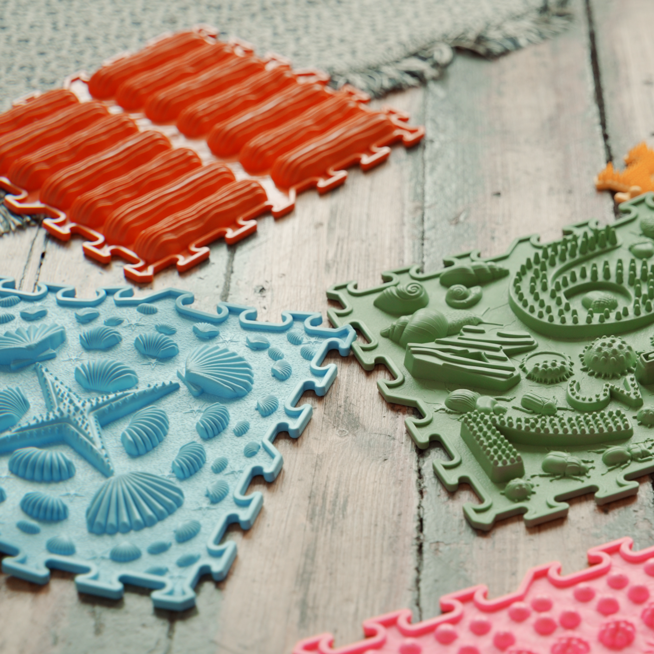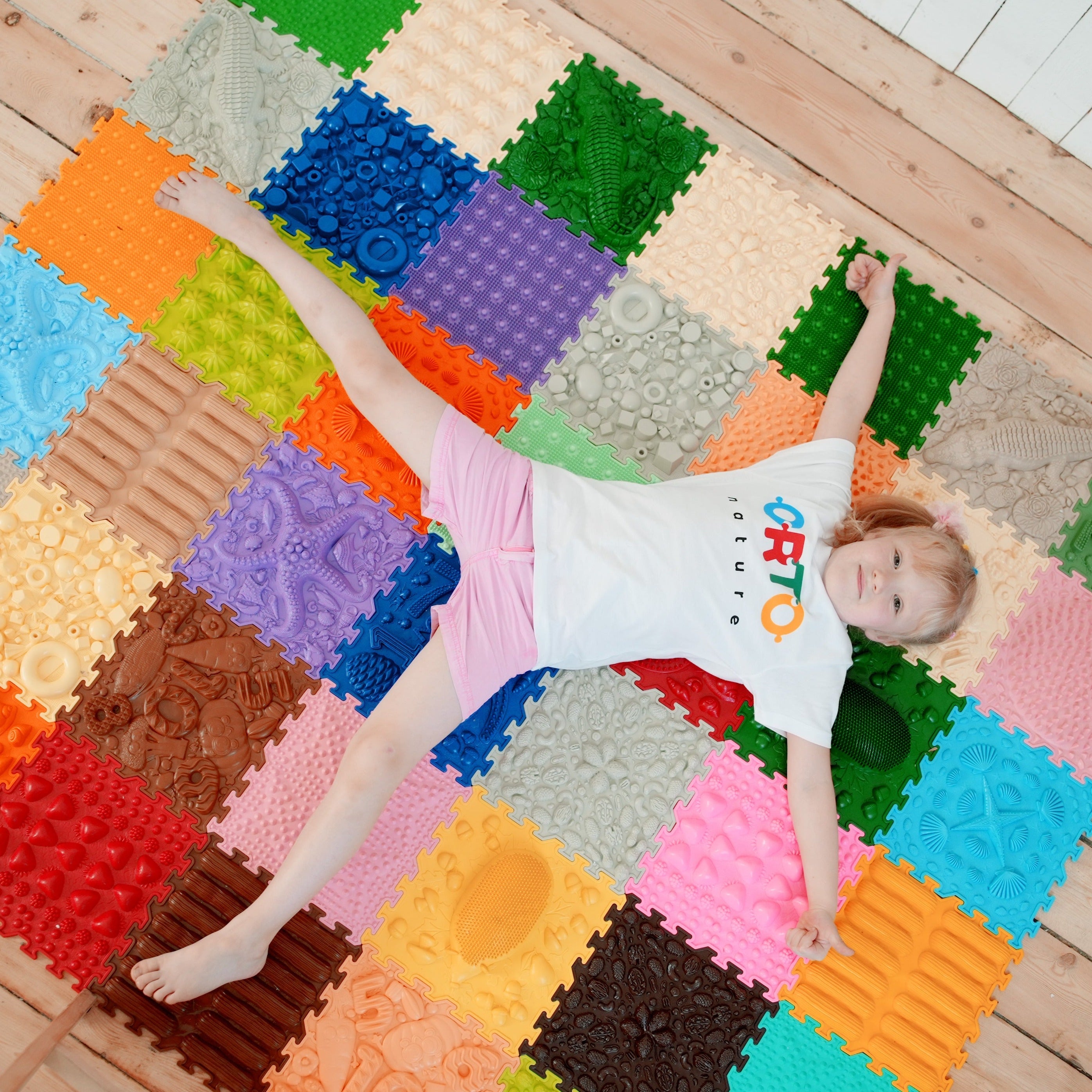 Ortonatures sensoriska matta erbjuder ett brett utbud av texturer och färger som stimulerar fantasin, förbättrar blodcirkulationen, hjälper till att korrigera platta fötter, hjälper till att ta bort svullnad i benen och stöder vestibulära systemet.