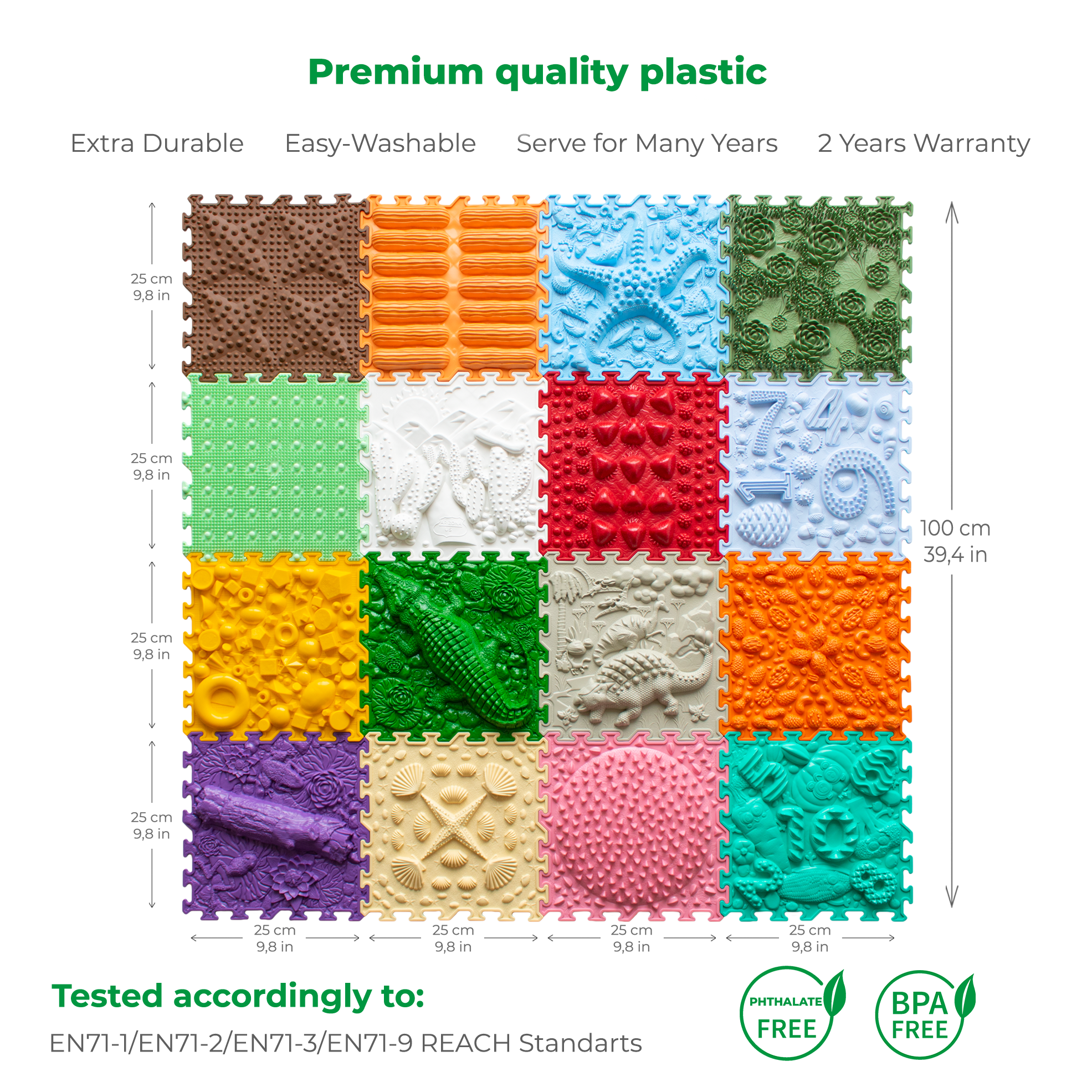 Ortonatures sensoriska matta är tillverkad av högkvalitativ PVC (polyvinylklorid) utan BPA eller ftalater, vilket gör den hållbar, lätt att tvätta och med lång livslängd.