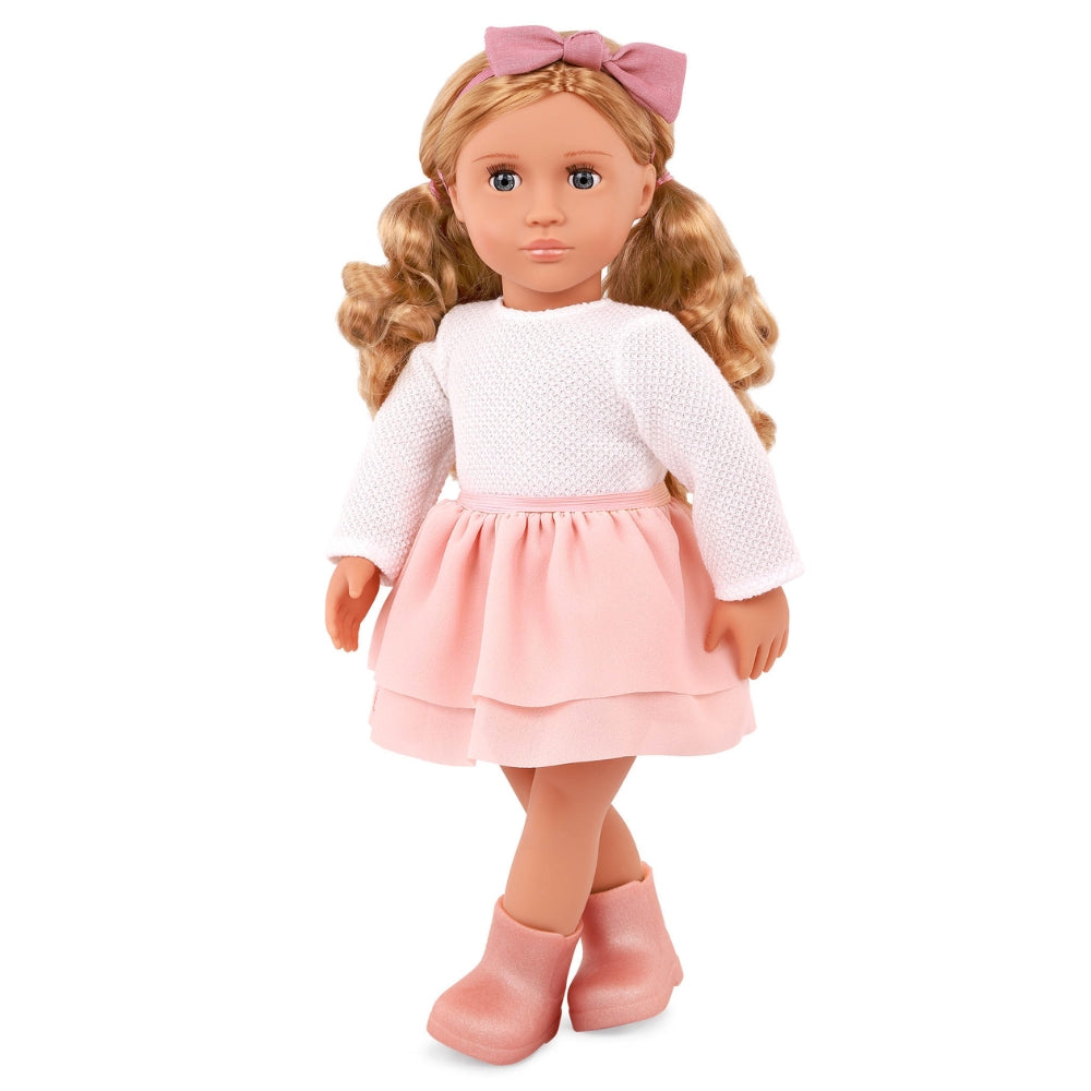 En bedårande blond Effie-babydocka i en ljus stil med vita och subtila rosa nyanser från Our Generation.
