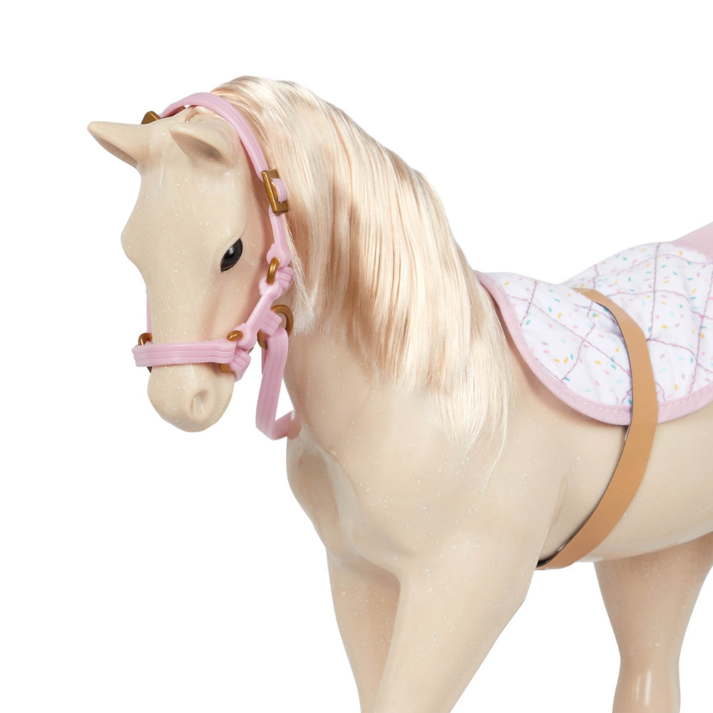 Söt häst för dockföl av rasen Palomino Party med dekorativ päls och diverse tillbehör från Our Generation.