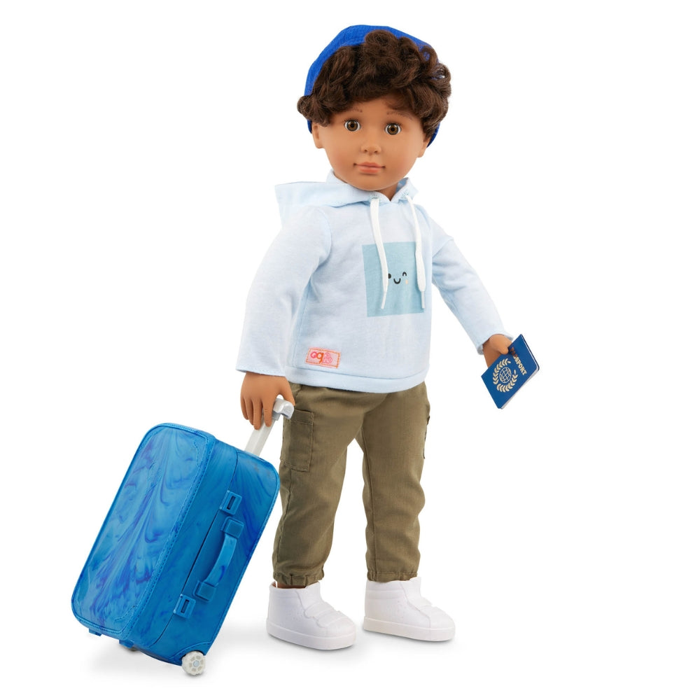 Härlig Milo-babydocka med resväska och resetillbehör från Our Generation.
