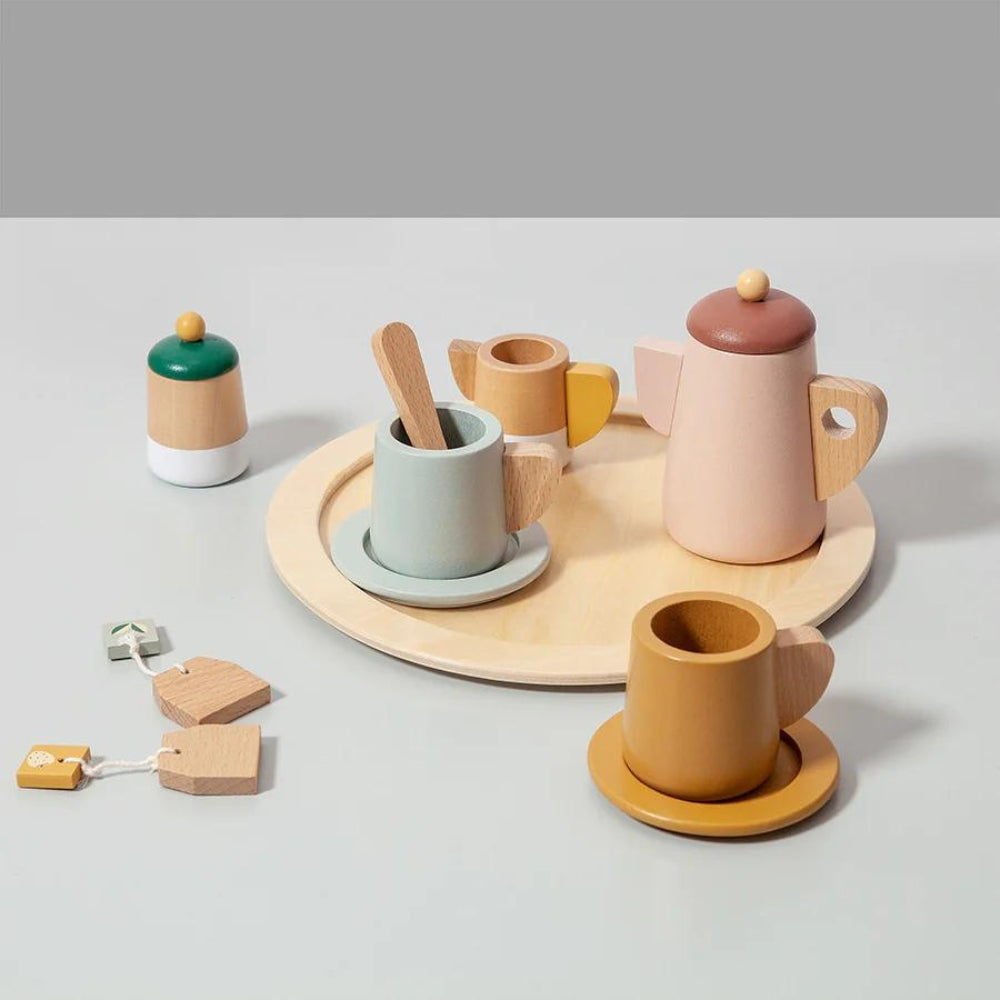 Teservisen för barn i trä lär ditt barn att välkomna gäster och servera te till hela familjen