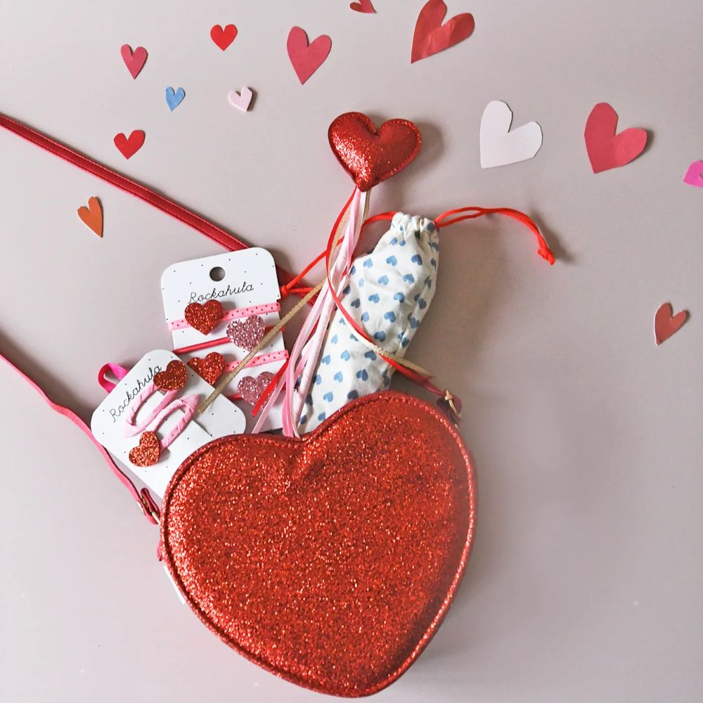 Setet består av fyra elastiska band dekorerade med bedårande glitterhjärtan.