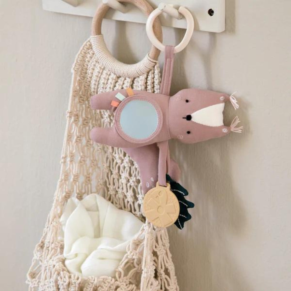 Barnvagnssmycke i vacker rosa färg med vita detaljer på ansiktet och svansen.