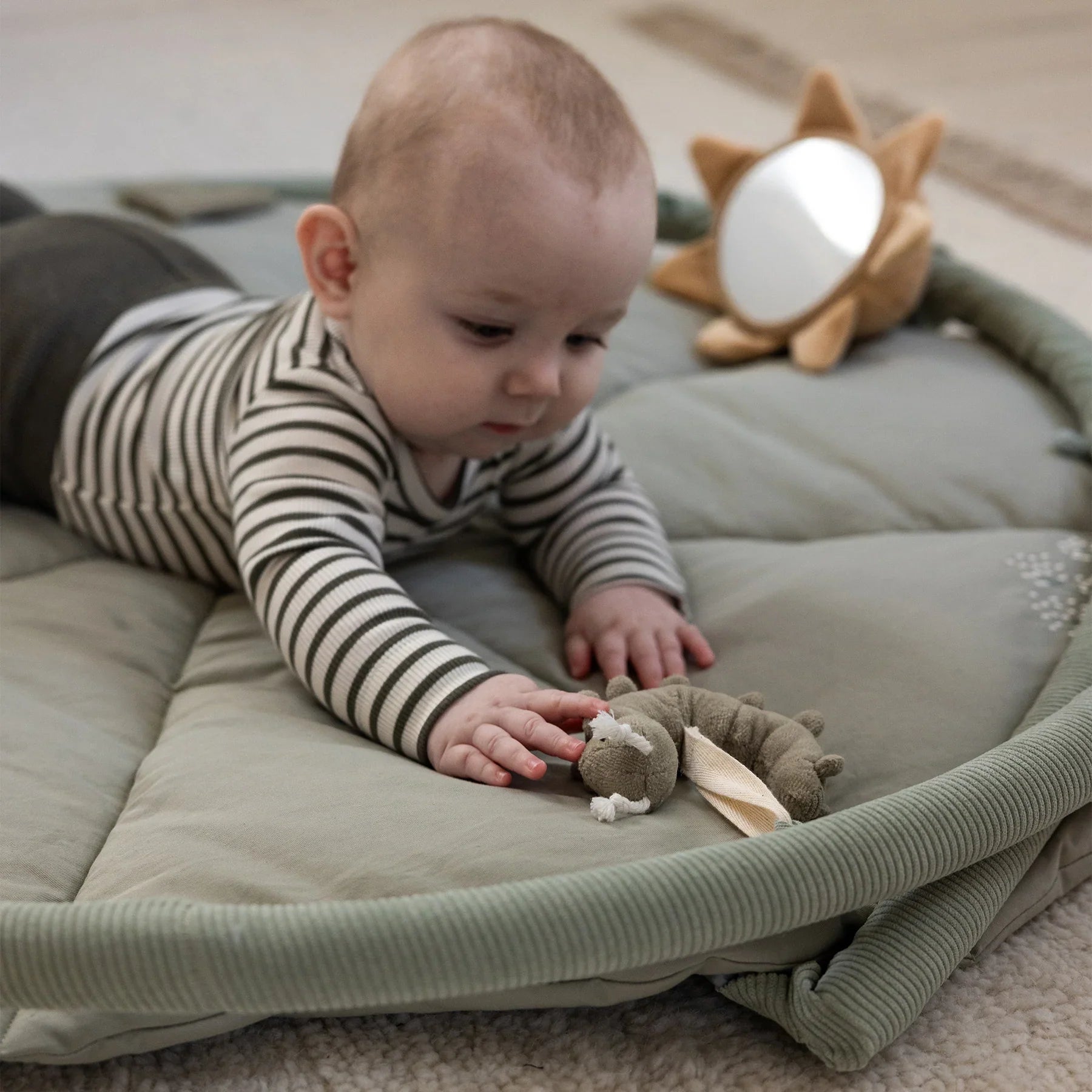Inlärningsmattan erbjuder barnet en säker och mysig plats att utforska världen på, både på rygg och mage.