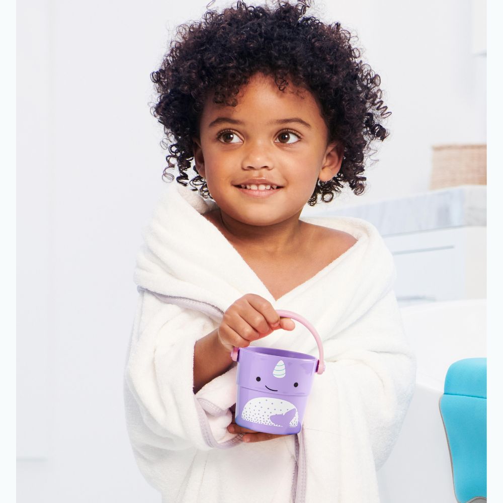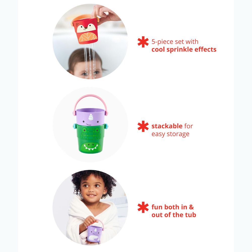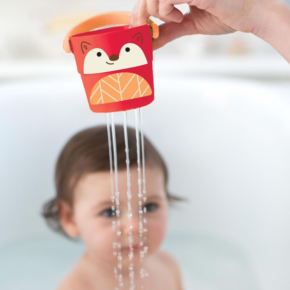 Badleksaken från Skip Hop gör det möjligt för barn att tömma vattnet på olika sätt och stapla hinkarna efter lektiden för enkel förvaring.